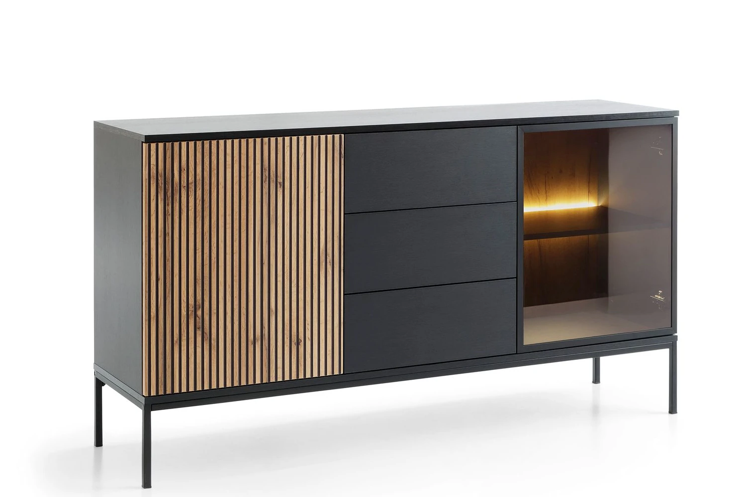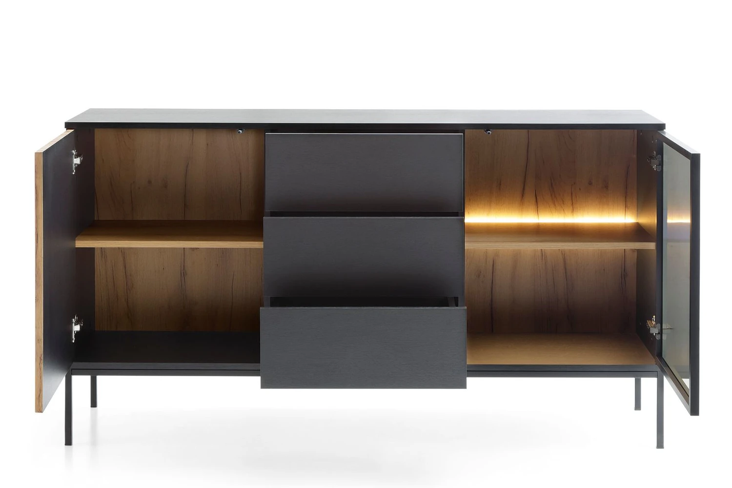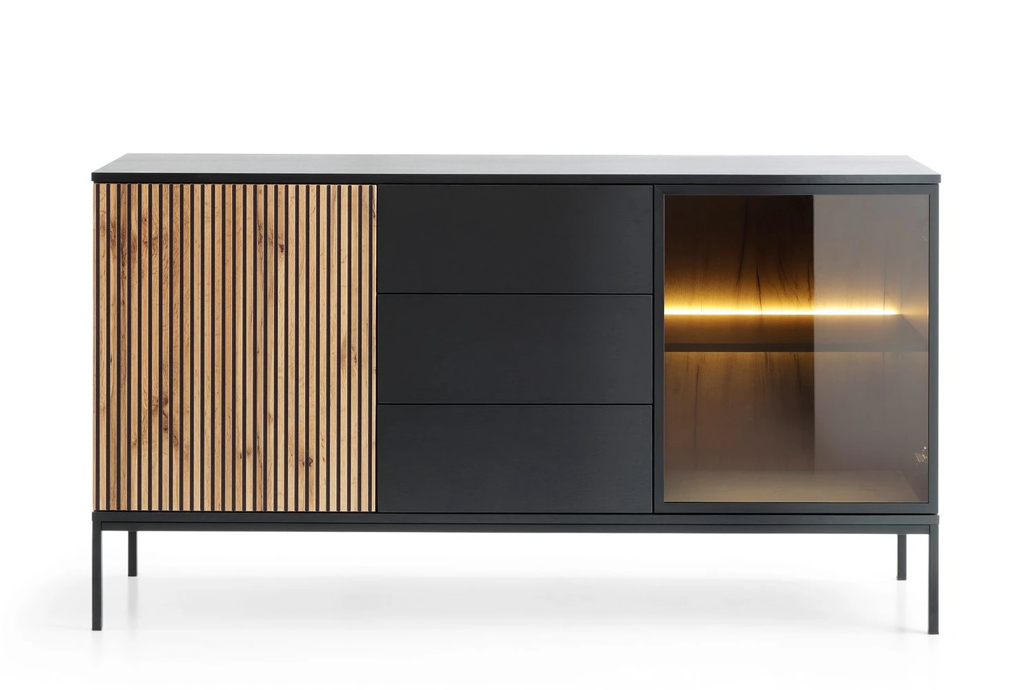 Komoda loftowa Linea Dąb Wotan z oświetleniem LED to połączenie eleganckiego dekoru drewna z czarnym korpusem i smukłymi metalowymi nogami. Mebel oferuje pojemne szafki, trzy praktyczne szuflady oraz przeszkloną witrynę z podświetleniem, dzięki czemu świetnie sprawdzi się jako komoda do salonu w stylu loft.