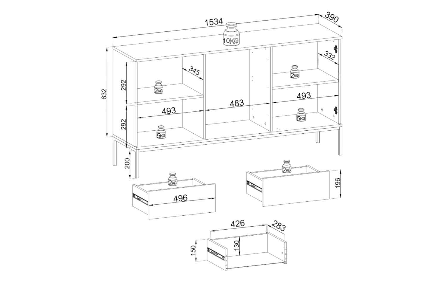 Wymiary sprawiają, że komoda z oświetleniem LED do salonu jest na tyle pojemna, by zastąpić tradycyjny bufet, a jednocześnie nie przytłacza przestrzeni. To idealny wybór, jeśli szukasz mebla, który łączy estetykę nowoczesnego loftu z dużą ilością miejsca do przechowywania.