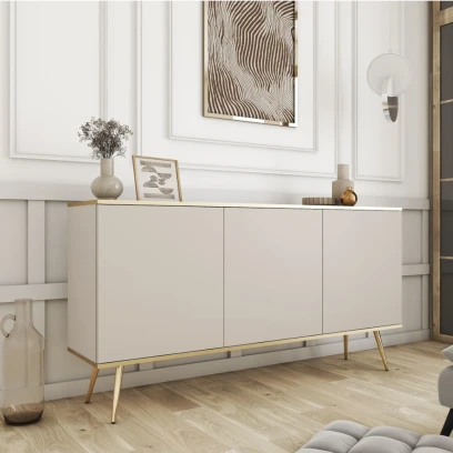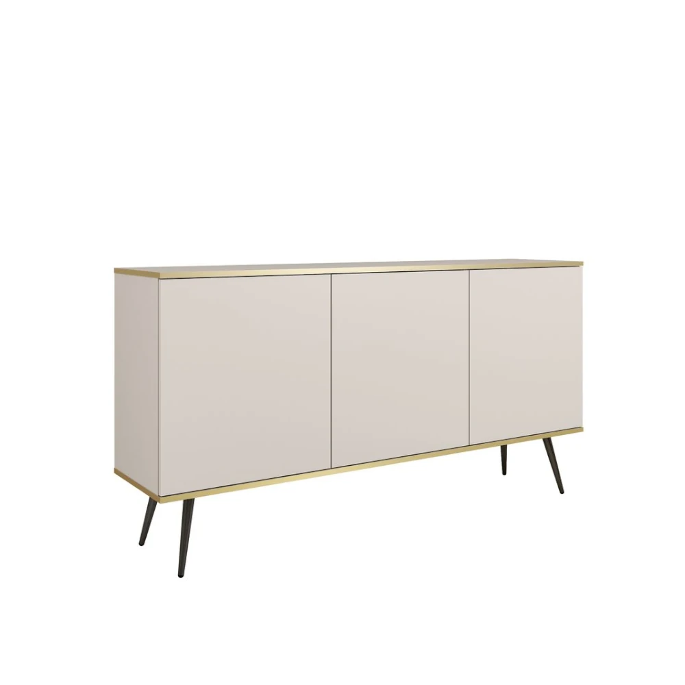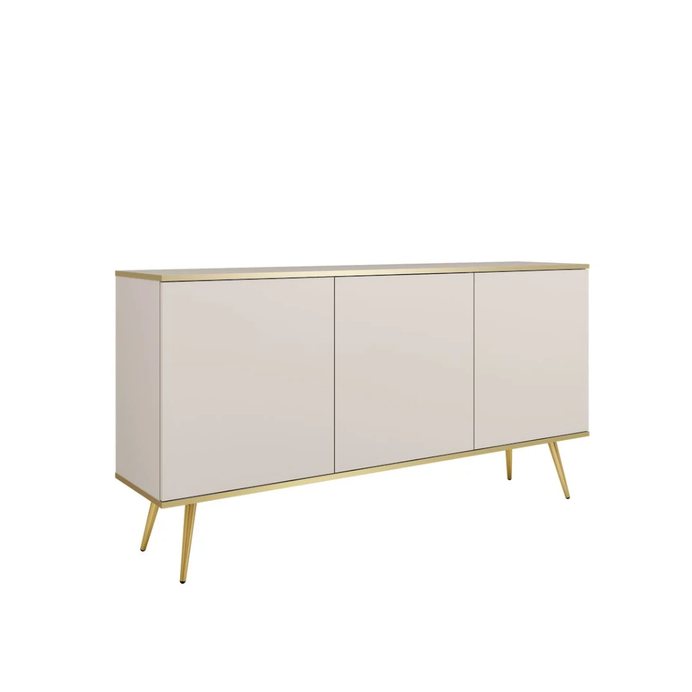 Komoda trzydrzwiowa Tora 160 cm to elegancki, nowoczesny mebel o prostej bryle. Gładkie, bezuchwytowe fronty, smukłe nogi oraz subtelne złote wykończenie krawędzi nadają jej lekkości i luksusowego charakteru, idealnego do salonu lub jadalni.