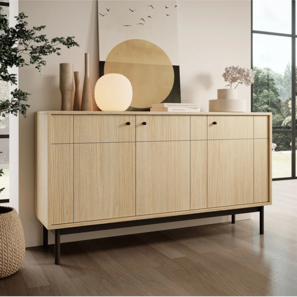Komoda trzydrzwiowa Elaro to elegancki, minimalistyczny mebel o lekkiej formie. Fronty z delikatnym podziałem linii oraz metalowe nogi tworzą nowoczesny akcent idealny do salonu, jadalni lub przedpokoju.