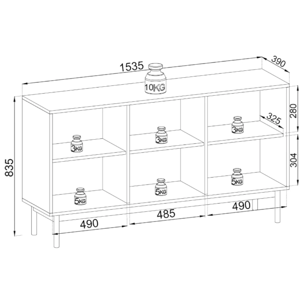 Za trzema frontami kryje się przestronna część z półkami, która bez trudu pomieści zastawę stołową, tekstylia, dokumenty lub inne domowe akcesoria. Taki układ sprawia, że komoda doskonale sprawdzi się w salonie, jadalni, sypialni czy gabinecie, wprowadzając do wnętrza ład i harmonię.