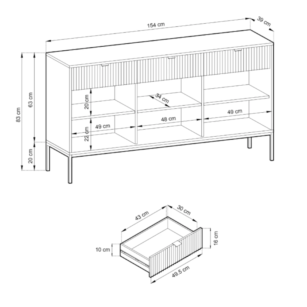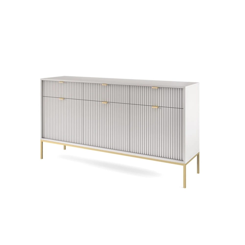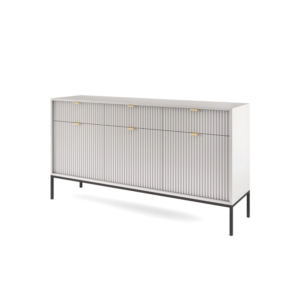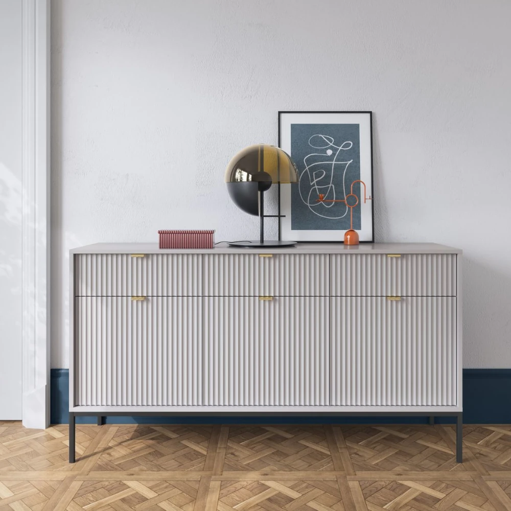 Komoda trzydrzwiowa Nuo zachwyca minimalistyczną formą i dekoracyjnymi, ryflowanymi frontami. Przemyślany układ szuflad i zamykanych przegród zapewnia wygodną organizację, a nowoczesny design doskonale uzupełnia eleganckie wnętrza.