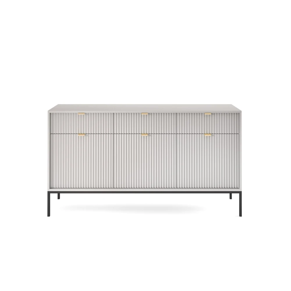 Komoda trzydrzwiowa Nuo to wyjątkowy mebel łączący nowoczesną stylistykę z wysoką funkcjonalnością. Jej charakterystyczne ryflowane fronty nadają całości elegancji i delikatnej struktury, a smukłe metalowe nogi podkreślają minimalistyczny charakter komody.