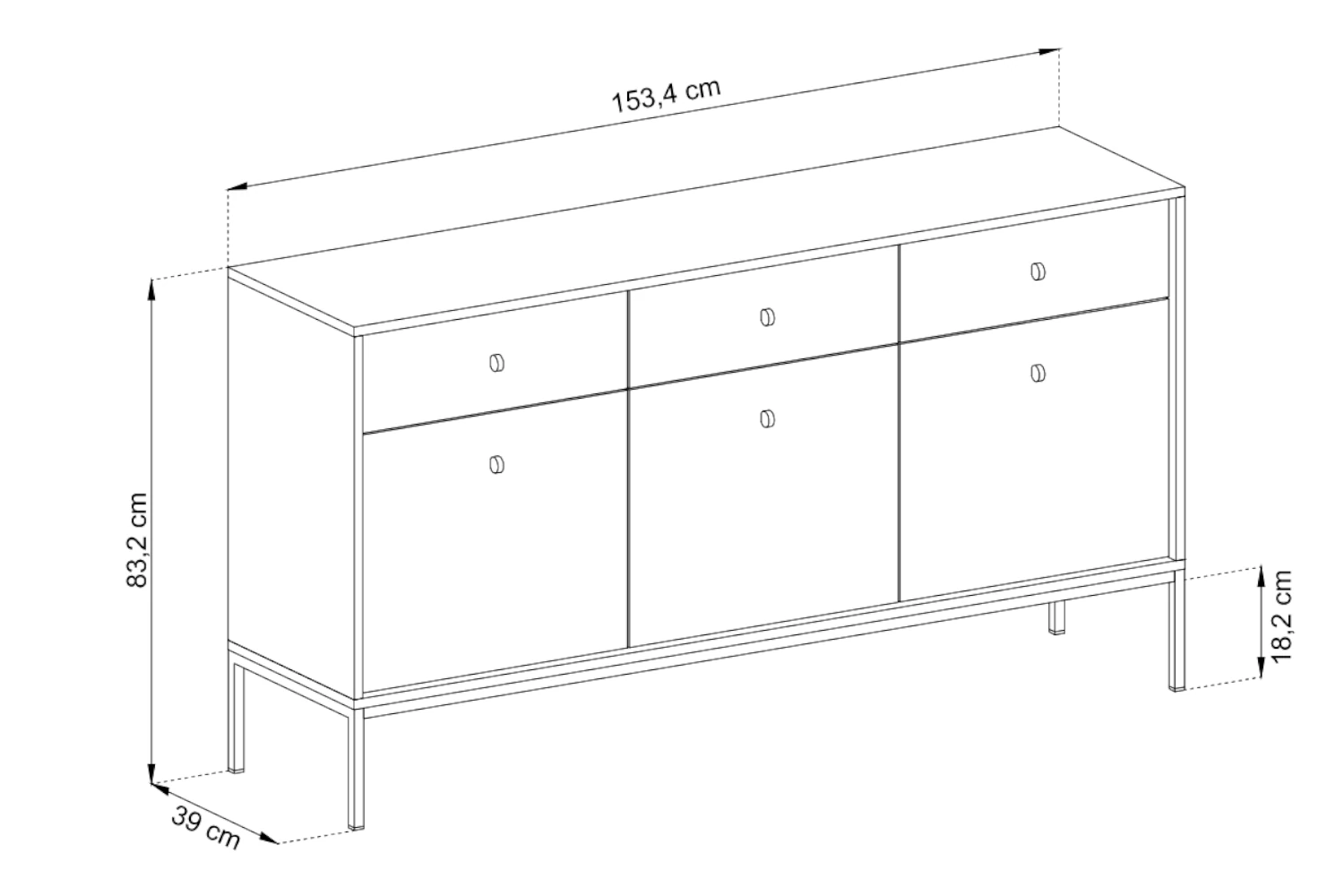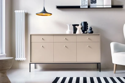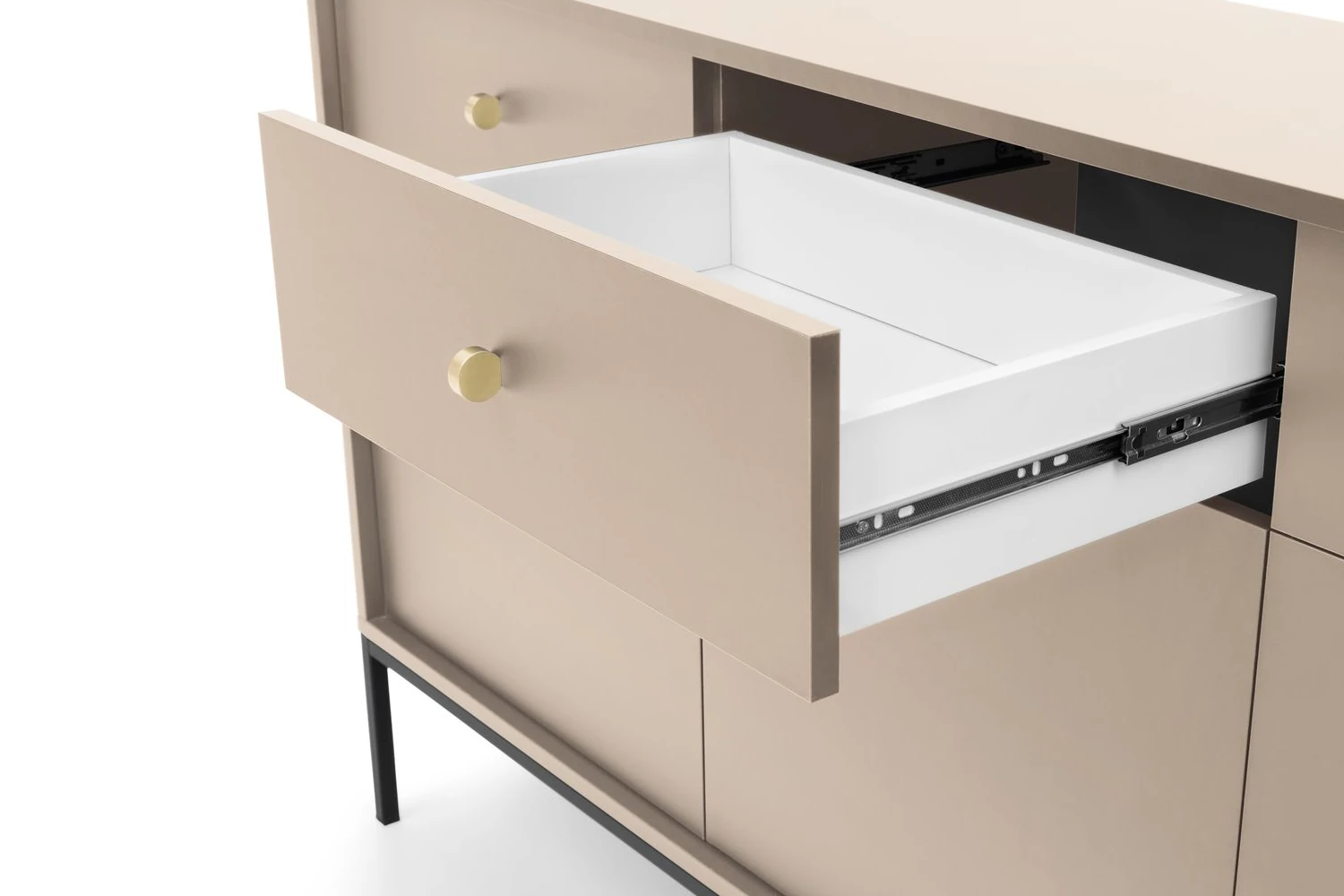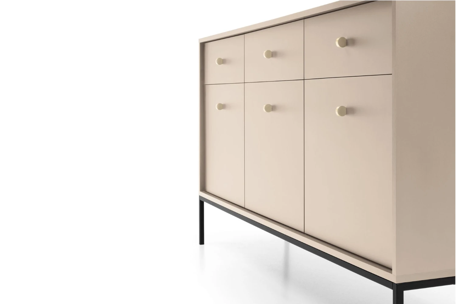 Komoda trzydrzwiowa z szufladami Noli to elegancki i wyjątkowo pojemny mebel, który stanie się centralnym punktem Twojego salonu lub sypialni. Wykończona w modnym, subtelnym odcieniu beżu, oferuje rozbudowaną przestrzeń do przechowywania dzięki połączeniu trzech zamykanych szafek oraz szuflad. Dzięki smukłym uchwytom i możliwości personalizacji koloru nóżek, komoda harmonijnie łączy nowoczesny design z funkcjonalnością, nadając wnętrzu luksusowy i uporządkowany charakter.