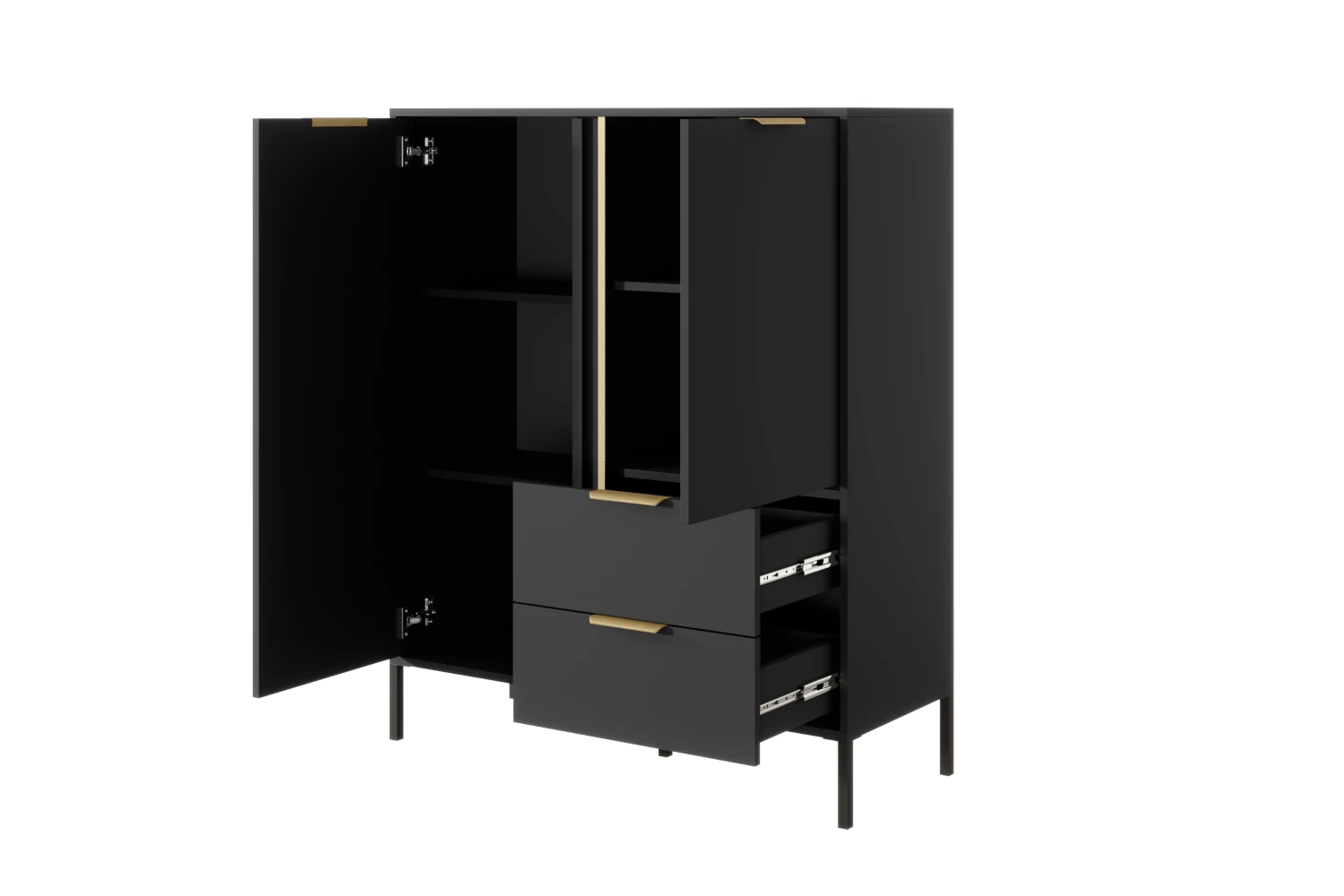 Komoda wysoka Axis dwudrzwiowa z szufladami to elegancki, nowoczesny mebel na wysokich nogach, który łączy pojemne szafki z praktycznymi szufladami i idealnie sprawdzi się w salonie, sypialni lub domowym gabinecie.