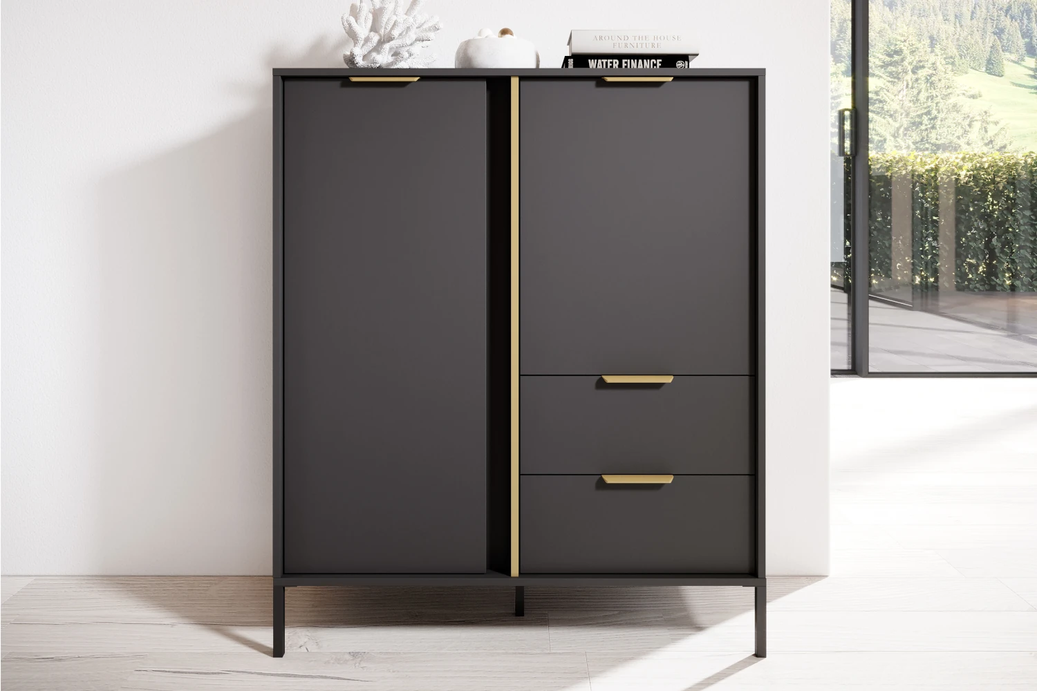 Minimalistyczna bryła w ciemnym wybarwieniu została przełamana złotymi uchwytami i pionową listwą dekoracyjną, dzięki czemu komoda przyciąga wzrok i dodaje aranżacji luksusowego charakteru. Wysokie, smukłe nóżki nadają całości lekkości i ułatwiają utrzymanie porządku pod meblem.