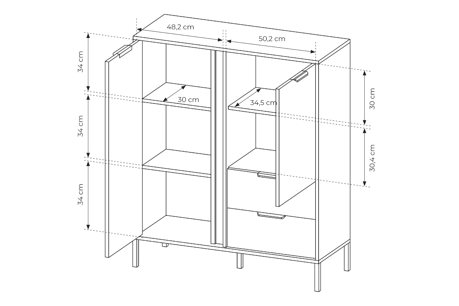 Za dwoma frontami drzwiowymi znajdziesz pojemne półki, idealne do przechowywania zastawy, tekstyliów, segregatorów czy ubrań. Dwie praktyczne szuflady po prawej stronie świetnie sprawdzą się na drobiazgi, dokumenty lub akcesoria, które chcesz mieć zawsze pod ręką.