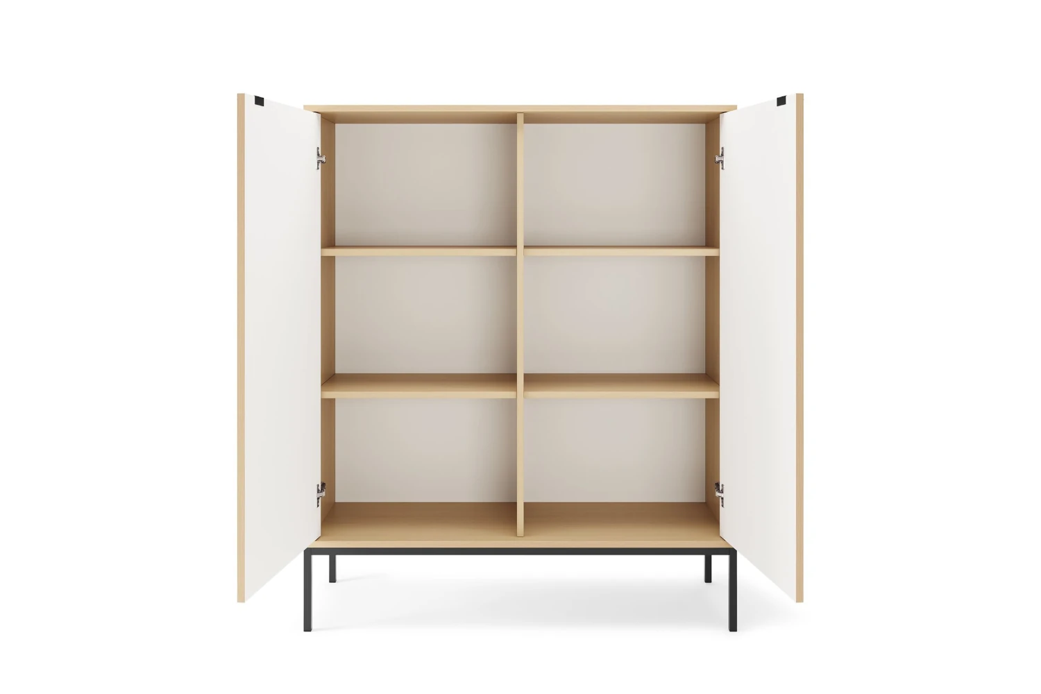 Ta stojąca komoda została zaprojektowana z myślą o maksymalnej użyteczności i doskonałej organizacji przestrzeni. Za drzwiczkami kryją się przestronne półki, które ułatwiają przechowywanie dokumentów, ubrań czy zastawy stołowej. Korpus mebla wykonano z wytrzymałej płyty laminowanej, a krawędzie zabezpieczono obrzeżem ABS, co gwarantuje wysoką odporność na wilgoć i uszkodzenia mechaniczne. W projekcie postawiono na czystość formy i geometryczną precyzję, rezygnując ze zbędnych zdobień na rzecz szlachetnej struktury frontów. Całość osadzona jest na solidnej podstawie z nóżkami o wysokości 20 cm, co nie tylko nadaje bryle wizualnej lekkości, ale także pozwala na swobodną pracę robotów sprzątających pod meblem. Dzięki temu utrzymanie higieny w domu jest znacznie łatwiejsze, a mebel nie przytłacza wnętrza.