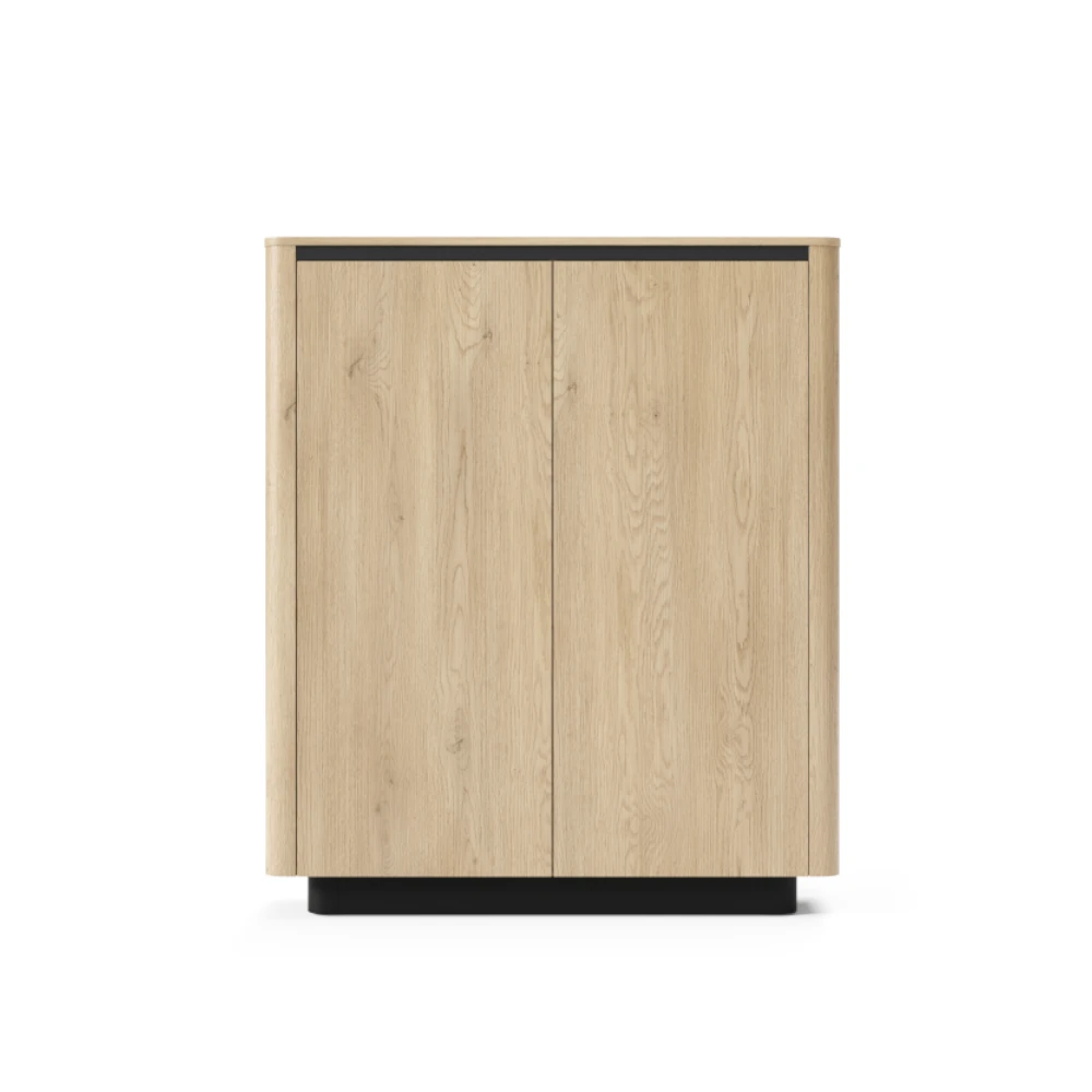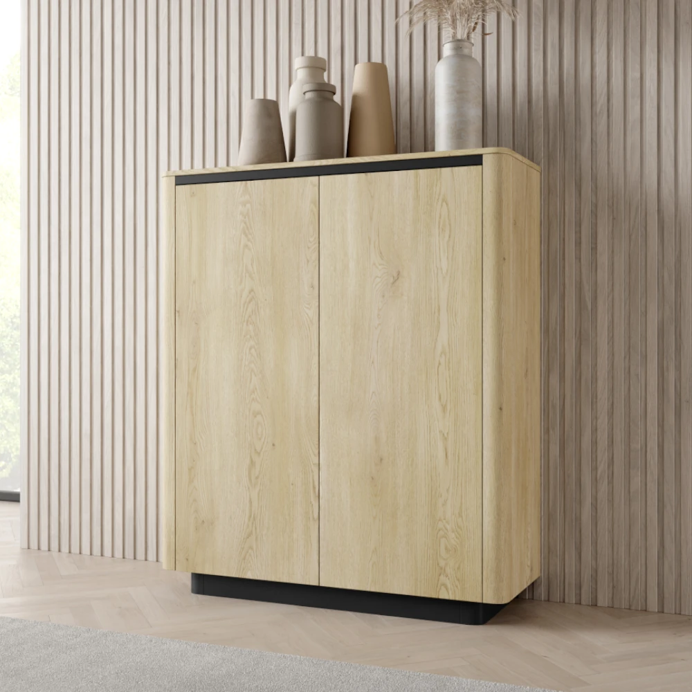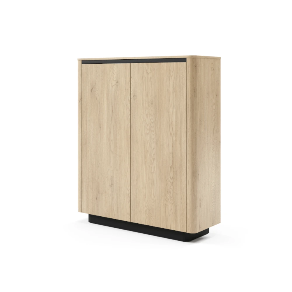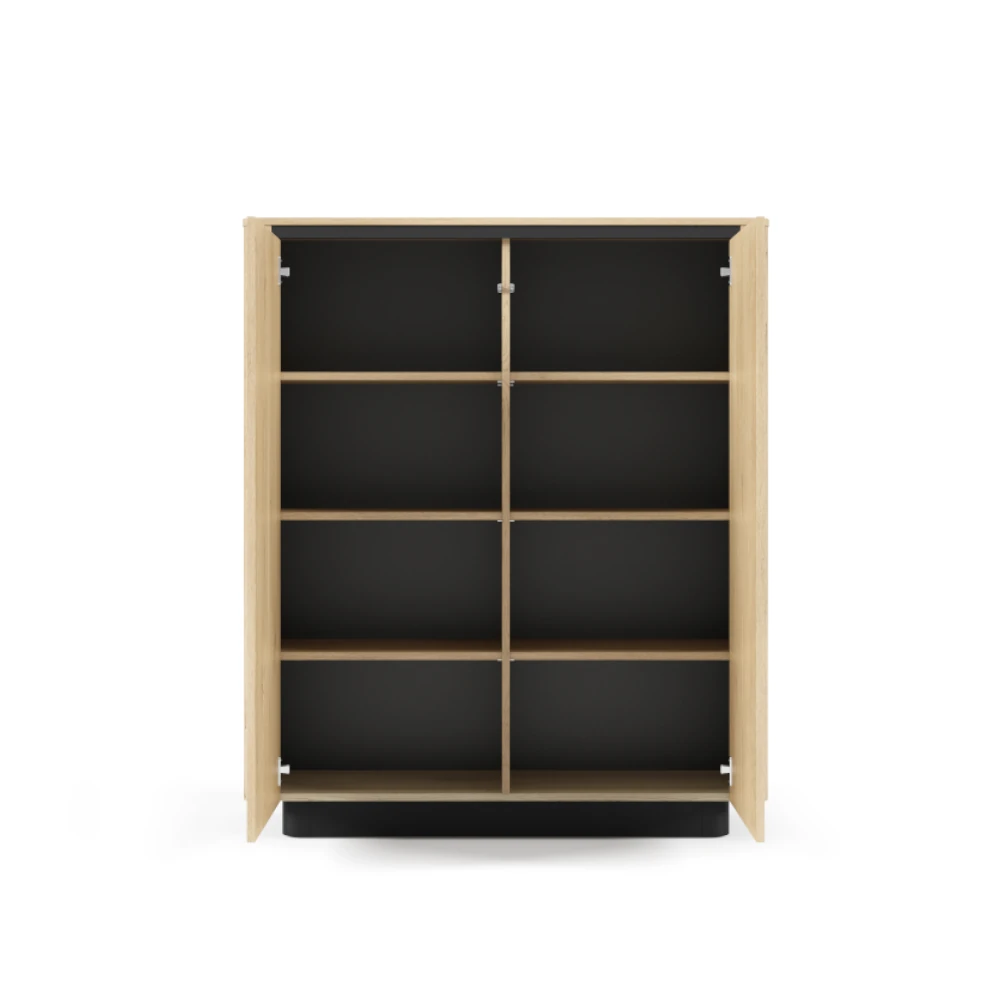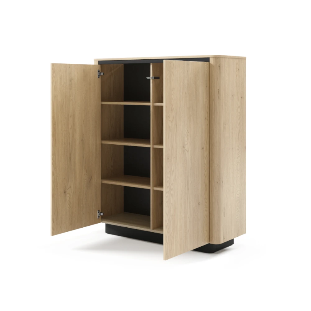 Komoda wysoka dwudrzwiowa Cala Dąb Cremona to nowoczesny mebel do salonu, jadalni lub przedpokoju, który łączy ciepły odcień drewna z czarną podstawą i wnętrzem. Pojemne półki za frontami ułatwiają przechowywanie dokumentów, tekstyliów czy zastawy stołowej, pomagając utrzymać porządek w domu.