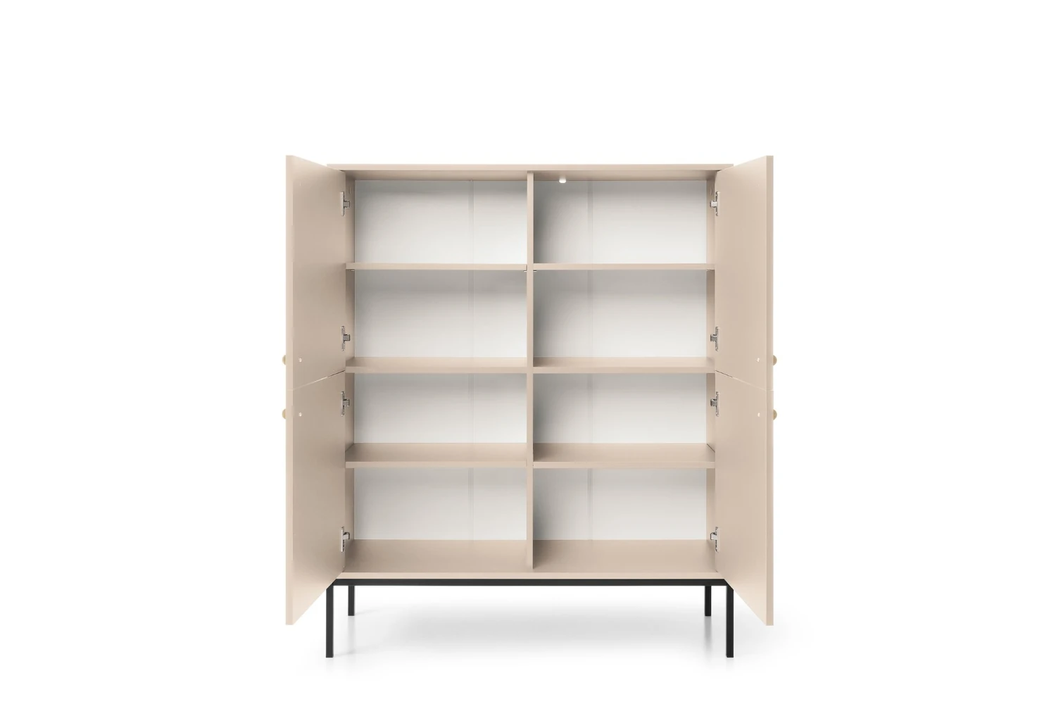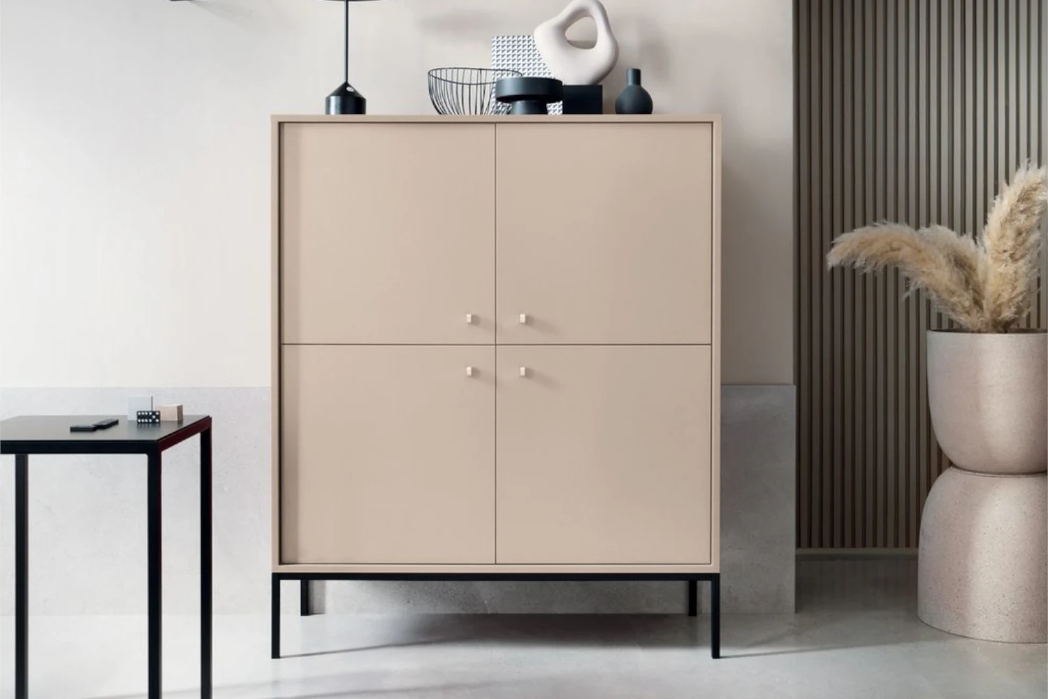 Komoda wysoka z drzwiczkami na nóżkach Noli to eleganckie i praktyczne rozwiązanie do przechowywania, które wnosi do wnętrza powiew nowoczesnej elegancji. Mebel o smukłej, wysokiej bryle został wyposażony w zamykane szafki, a subtelny odcień beżu piaskowego doskonale harmonizuje z minimalistycznymi uchwytami. Dzięki możliwości wyboru koloru nóżek czarnego lub złotego komodę można idealnie dopasować do charakteru salonu, sypialni czy przedpokoju, tworząc spójną i luksusową aranżację.