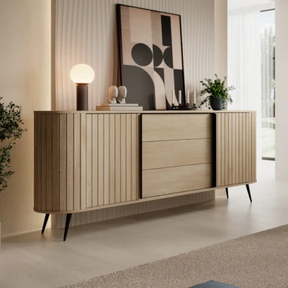 Komoda z drzwiczkami i szufladami Ardea dąb Cremona to nowoczesny mebel do salonu, jadalni lub domowego gabinetu. Ryflowane fronty w dekorze naturalnego dębu i smukłe, czarne nogi nadają jej lekki, wyrazisty charakter, który dobrze komponuje się z jasnymi i ciemnymi aranżacjami.