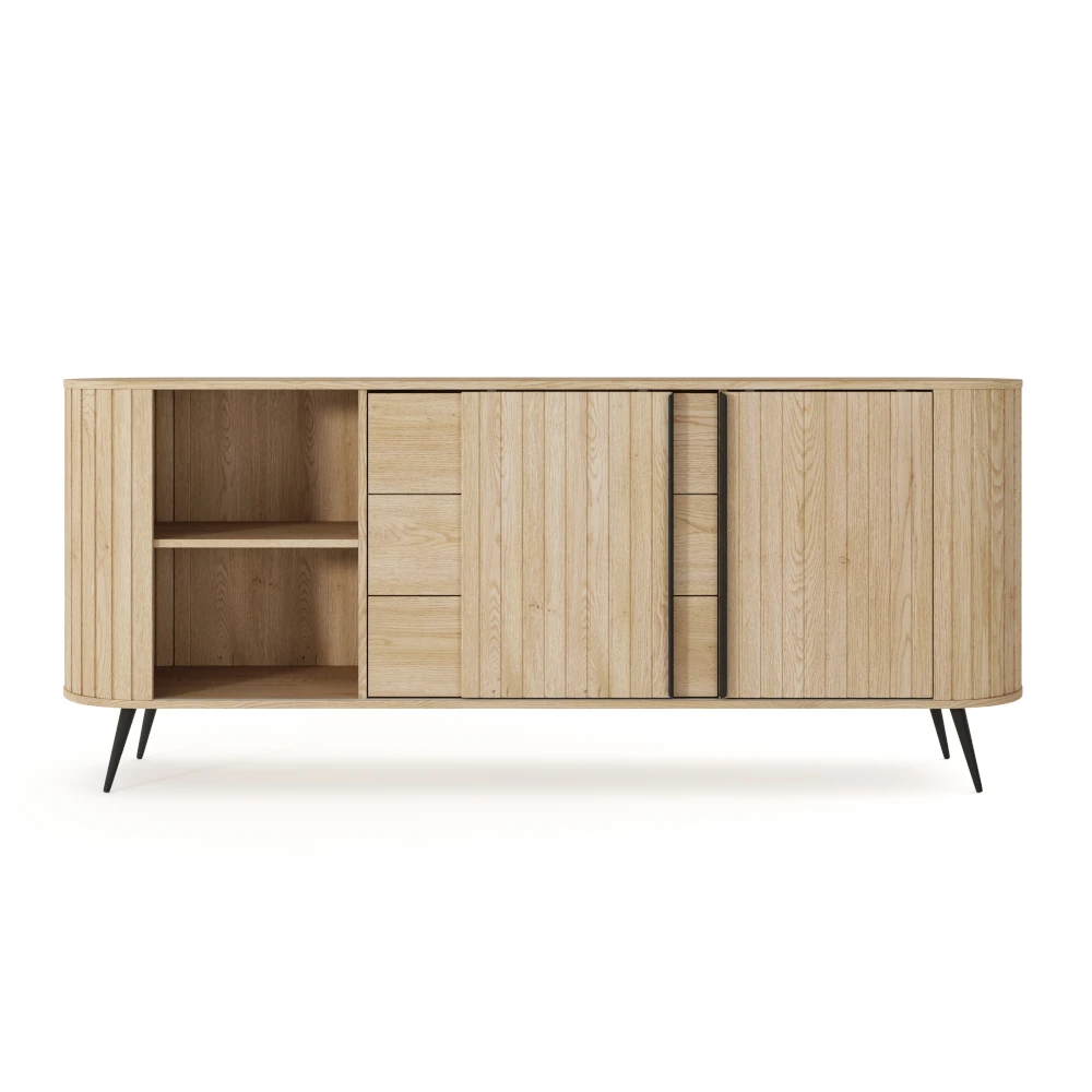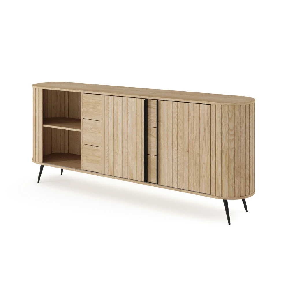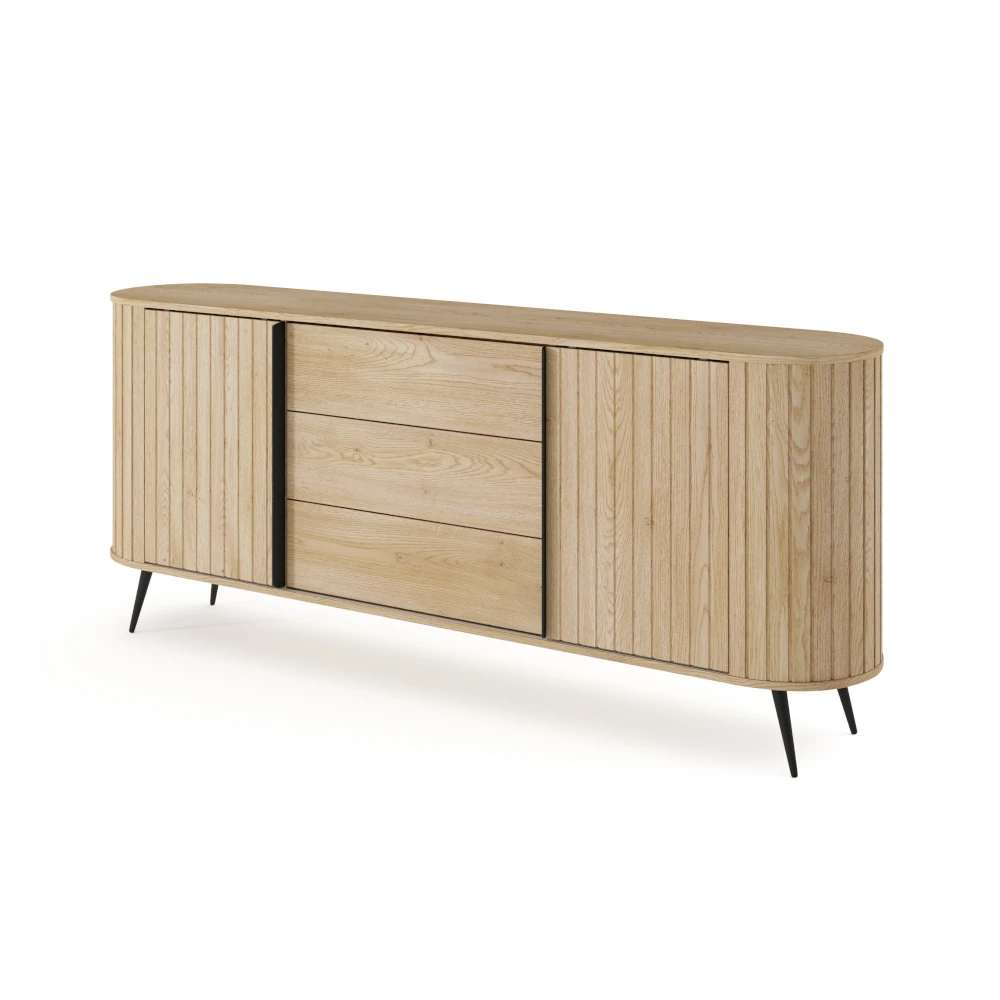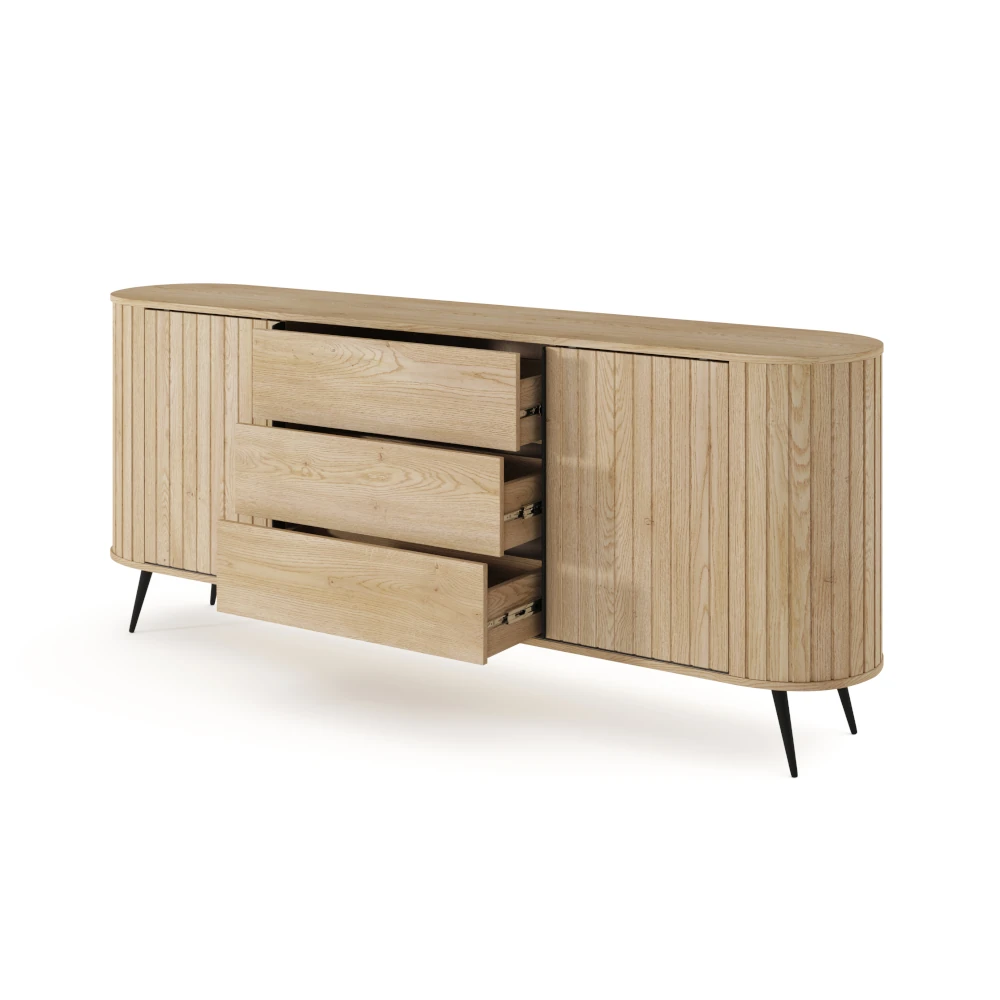 Komoda z drzwiczkami i szufladami Ardea dąb Cremona to pojemny, elegancki mebel do salonu lub jadalni, który łączy ryflowane fronty w kolorze naturalnego dębu z lekką formą na czarnych, metalowych nogach.