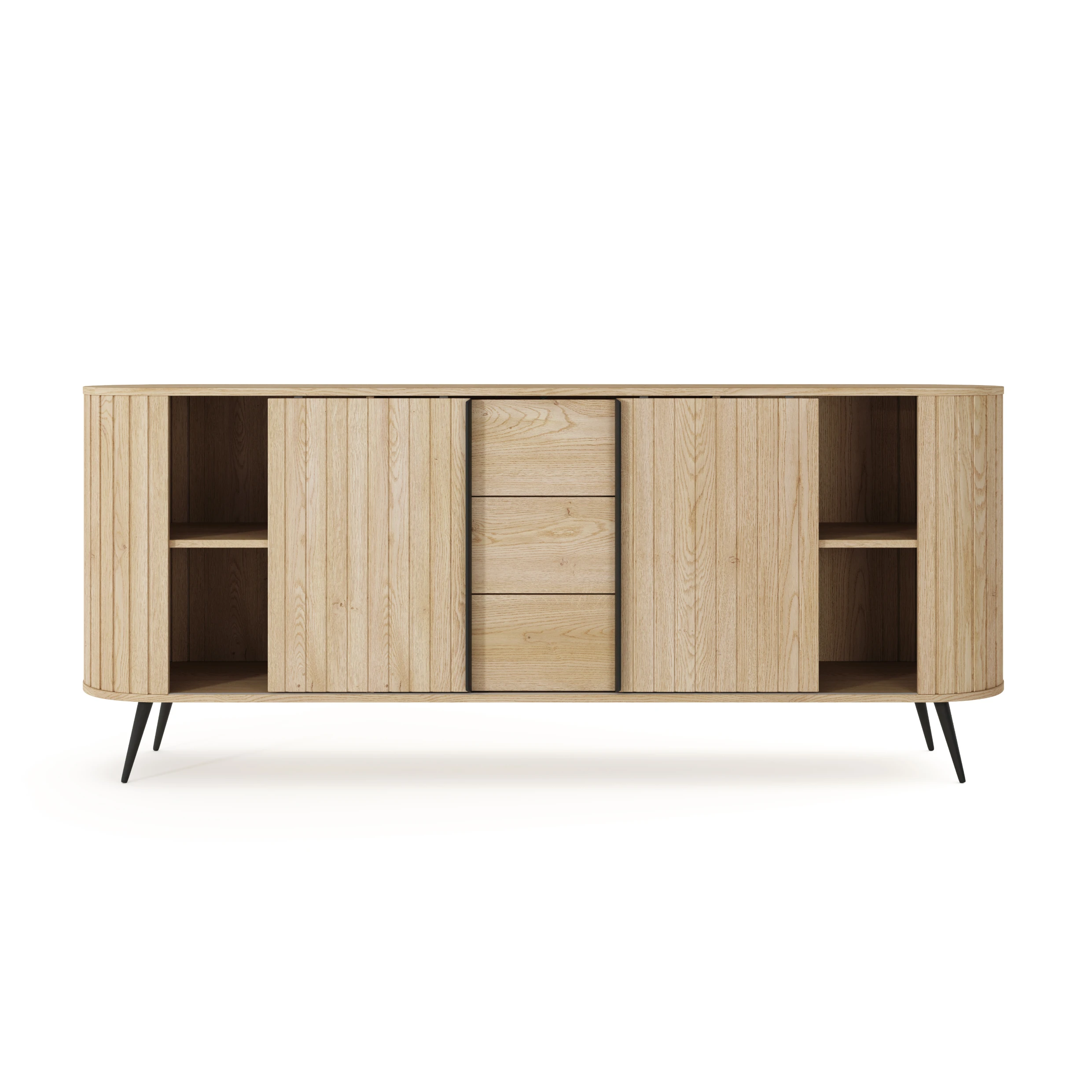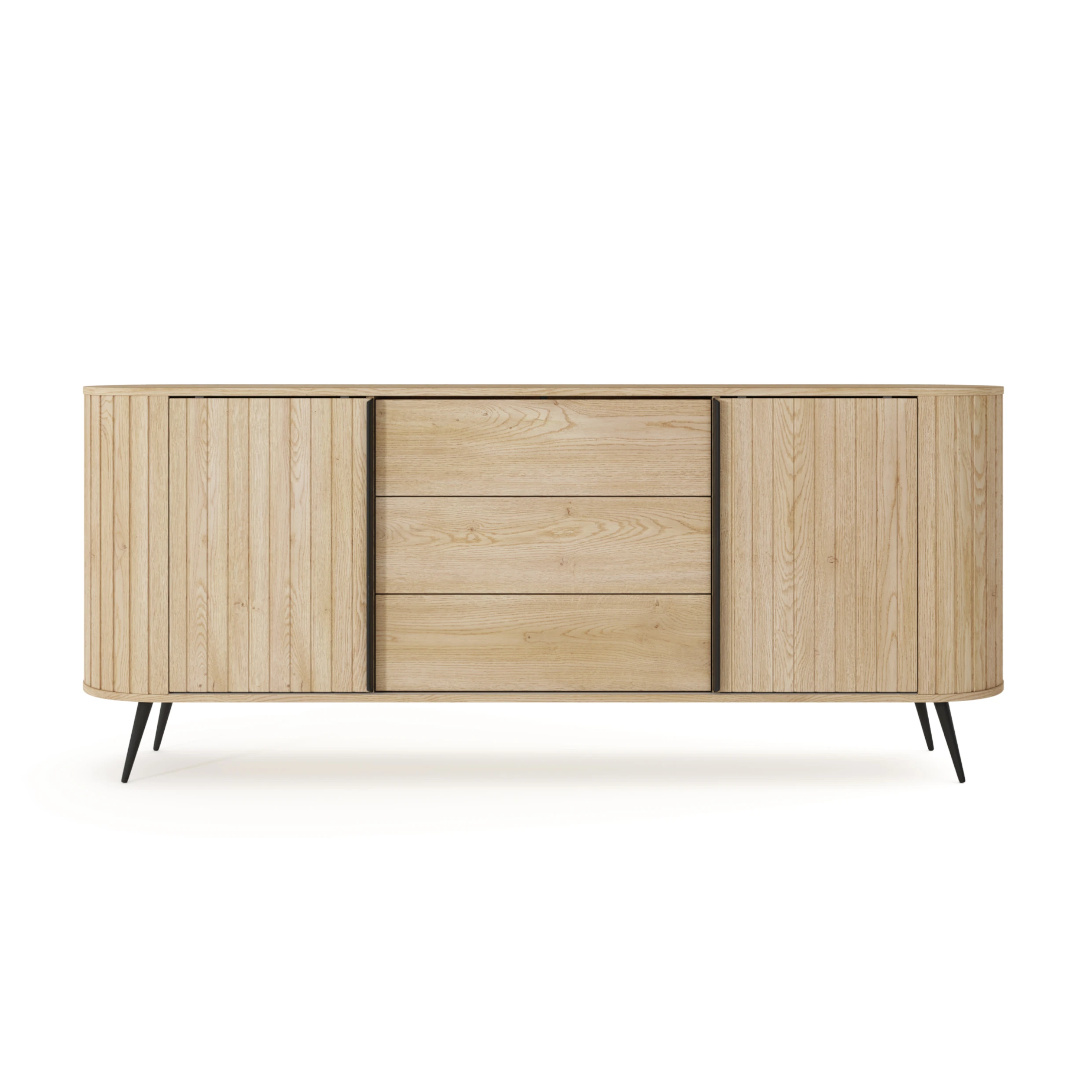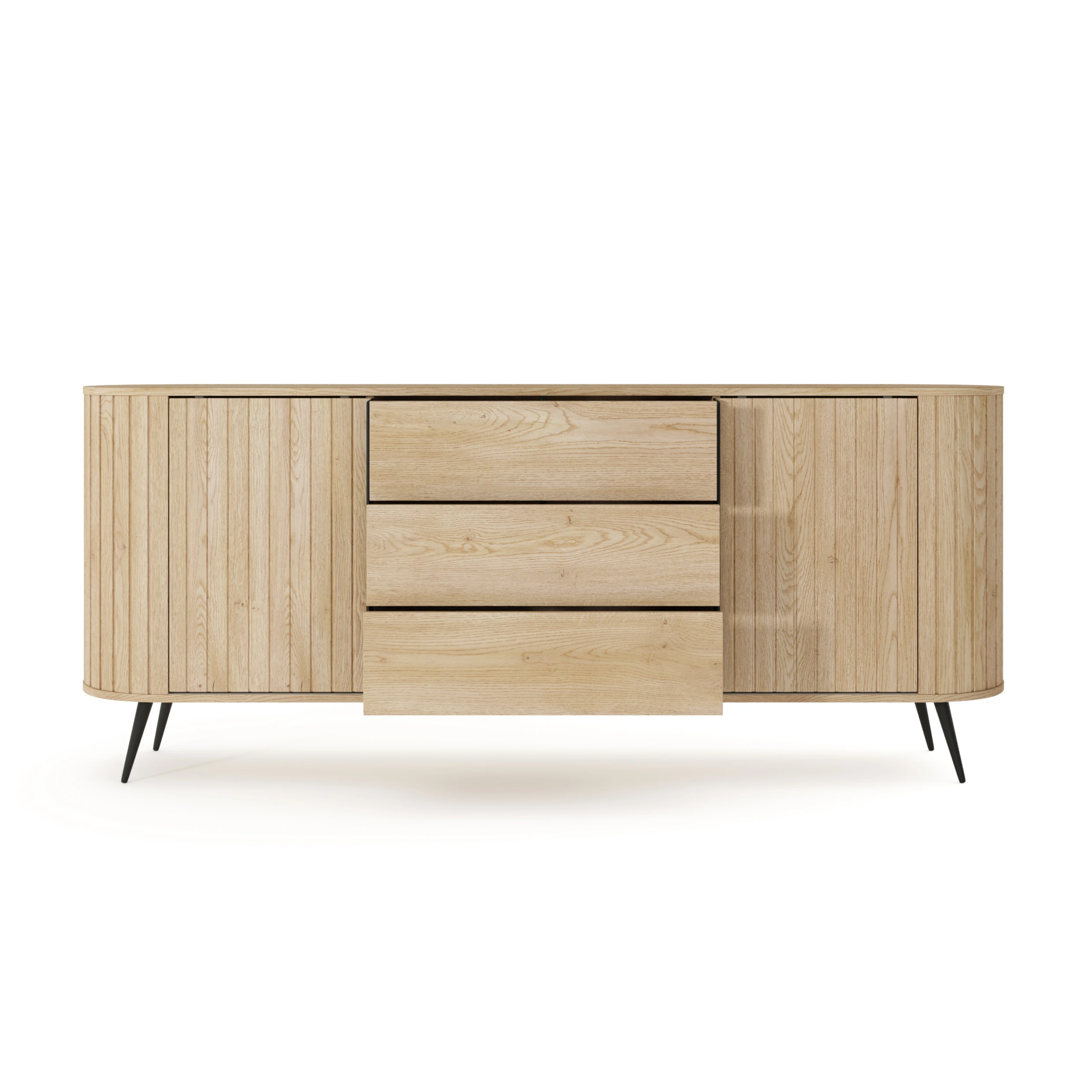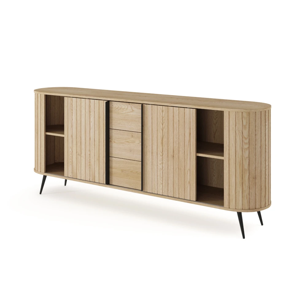 Komoda z drzwiczkami i szufladami Ardea dąb Cremona to pojemny, elegancki mebel do salonu lub jadalni, który łączy ryflowane fronty w kolorze naturalnego dębu z lekką formą na czarnych, metalowych nogach.
