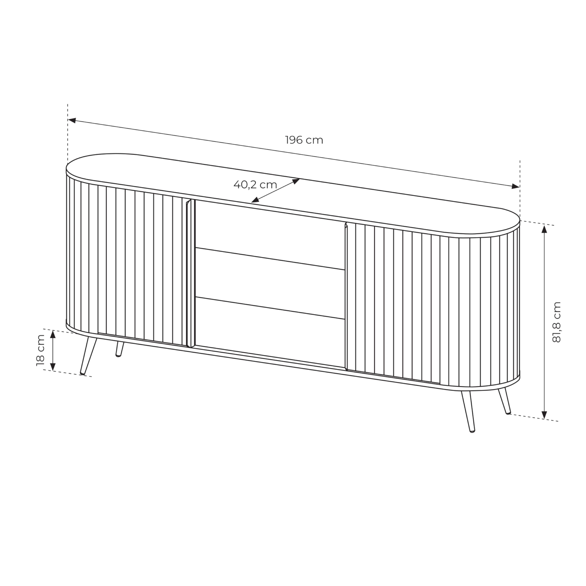 Wnętrze komody zaprojektowano z myślą o przechowywaniu. Dwie zamykane części z półkami pomieszczą zastawę stołową, tekstylia lub dokumenty, a trzy pojemne szuflady na prowadnicach kulkowych z pełnym wysuwem ułatwiają organizację drobniejszych przedmiotów. Blat o długości 196 cm to idealne miejsce na dekoracje, lampę lub rodzinne pamiątki.