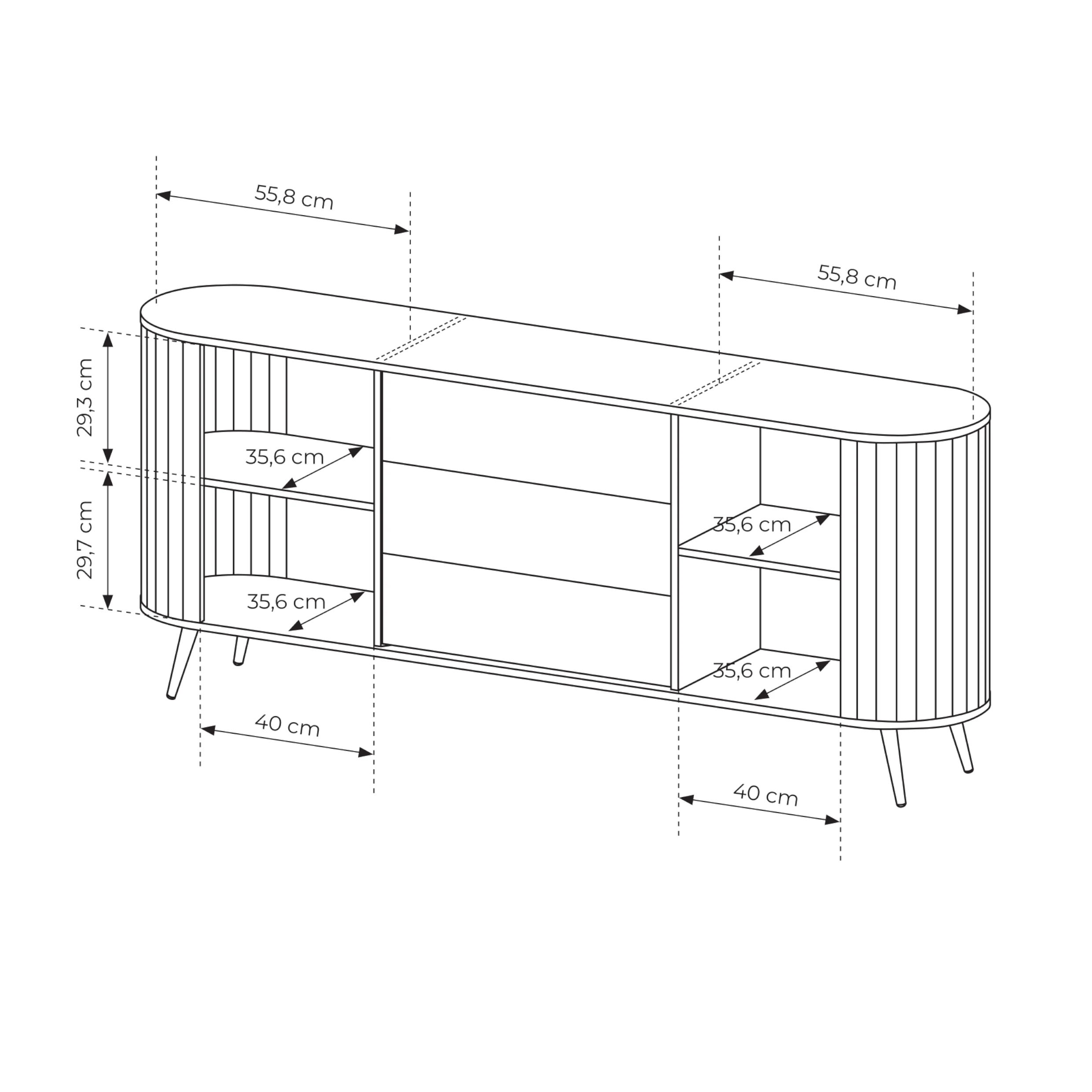 - Front: ryflowana płyta MDF 18 mm + płyta wiórowa laminowana 16 mm