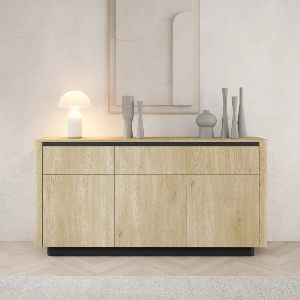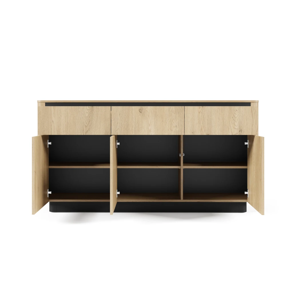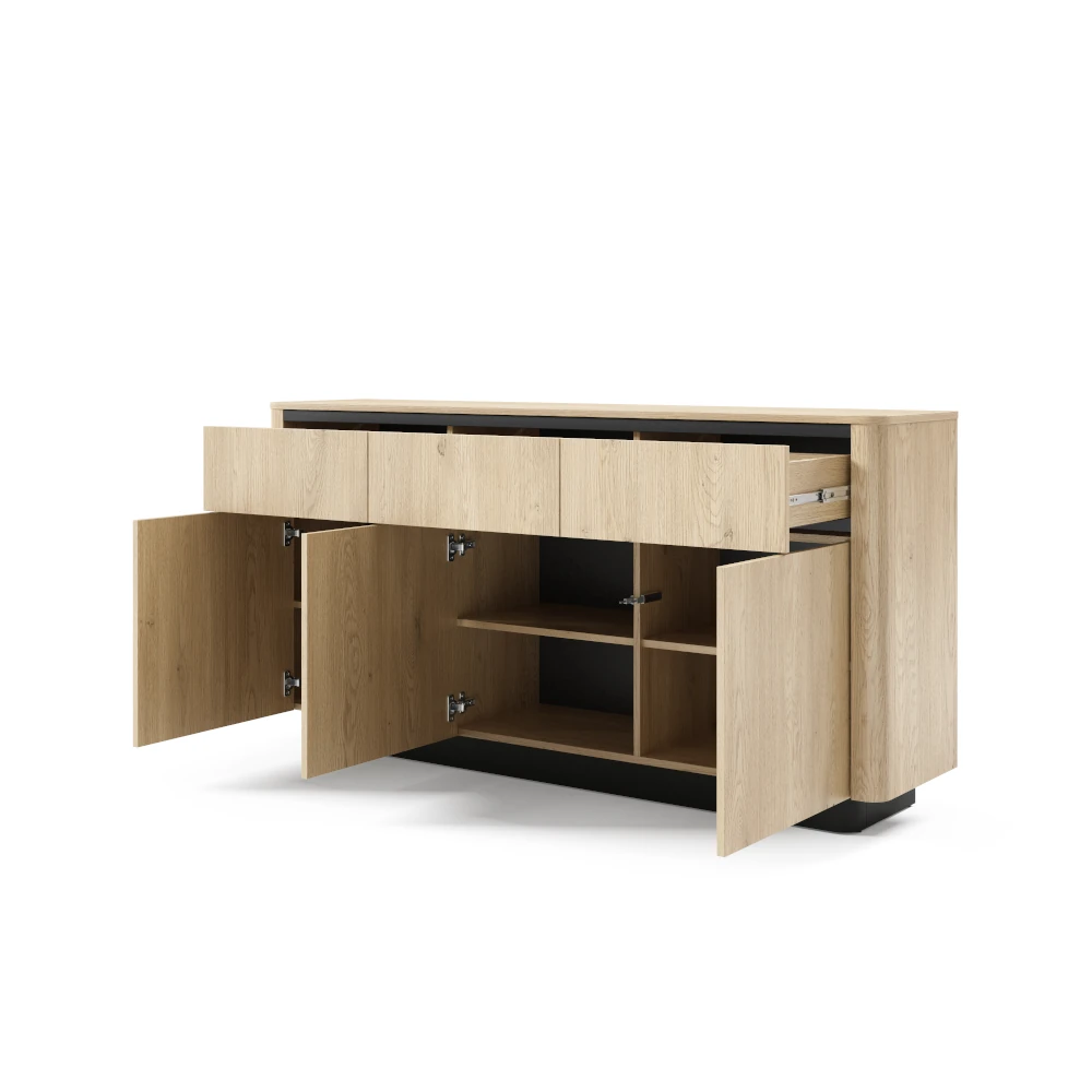 Nowoczesna komoda z drzwiczkami i szufladami Cala Dąb Cremona to pojemny mebel do salonu, jadalni lub przedpokoju. Ciepły dekor dębu połączony z czarną podstawą i ciemnym wnętrzem tworzy elegancki kontrast, a liczne półki i szuflady ułatwiają utrzymanie porządku w domu.