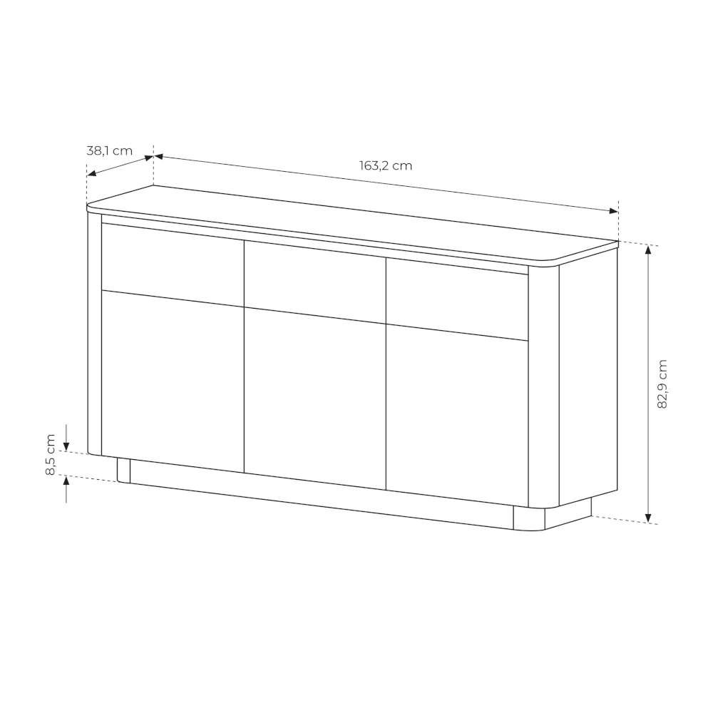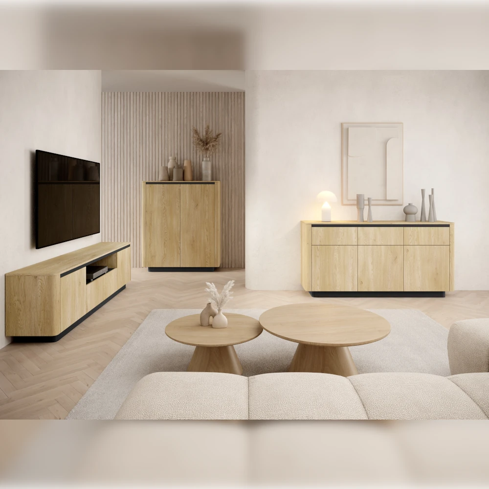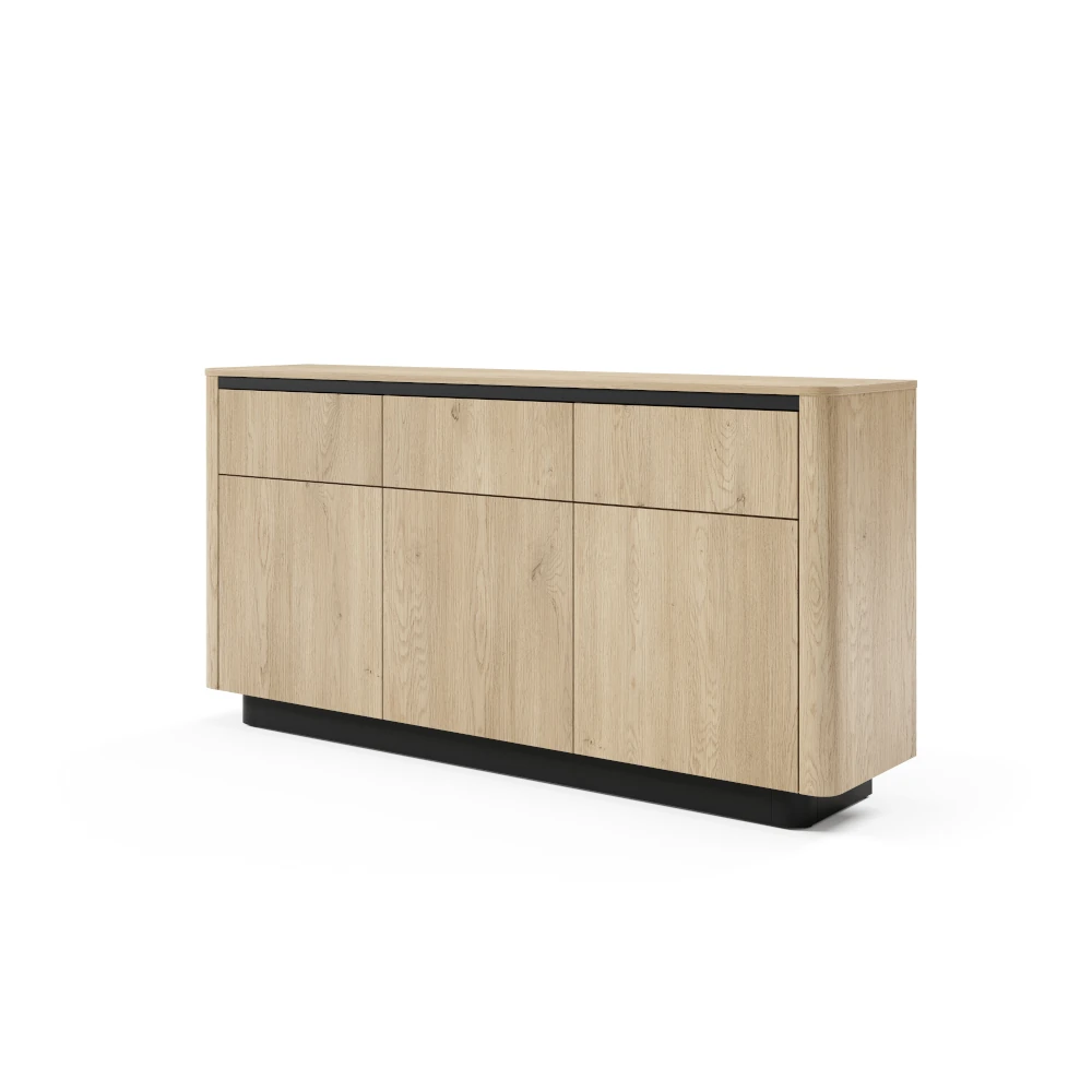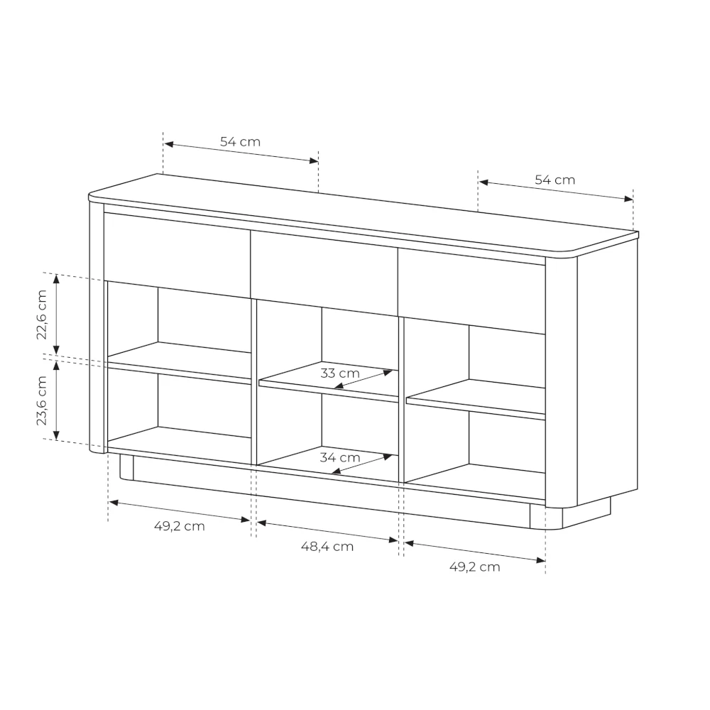 W górnej części komody znajdują się praktyczne szuflady, idealne na drobniejsze akcesoria - tekstylia stołowe, dokumenty czy drobiazgi, które warto mieć pod ręką. Poniżej umieszczono pojemne szafki z półkami, w których wygodnie przechowasz zastawę stołową, szkło, gry planszowe czy inne domowe akcesoria. Przemyślany podział wnętrza ułatwia organizację i pozwala w pełni wykorzystać przestrzeń komody.
