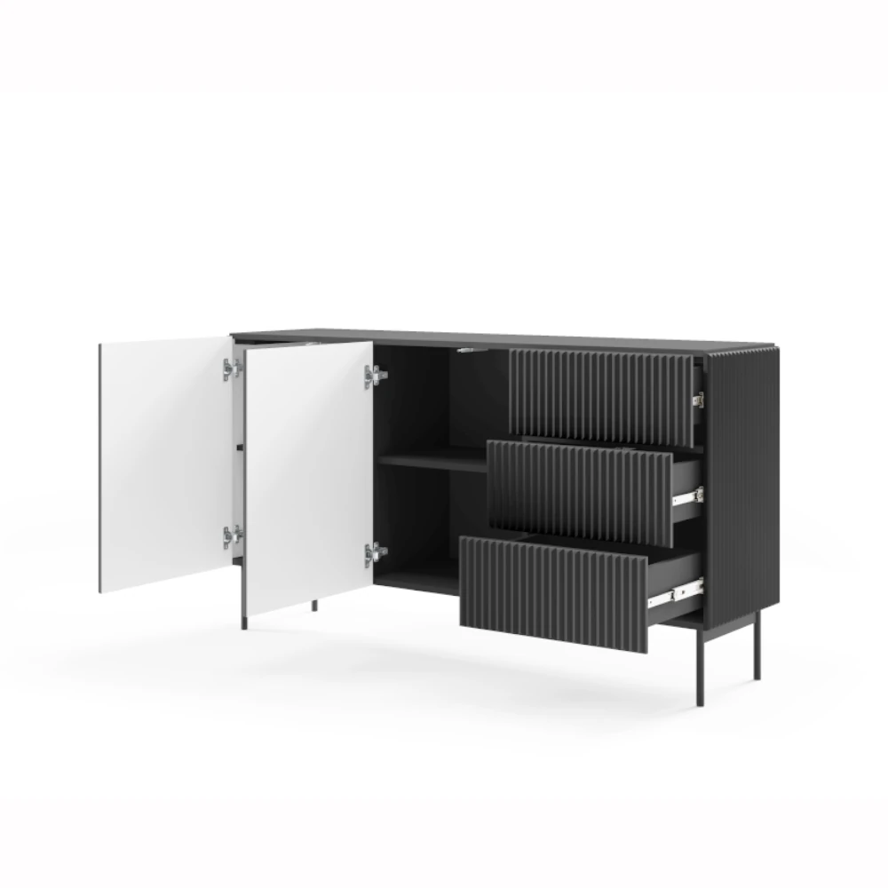 Elegancka komoda z drzwiczkami i szufladami Rillo 147 cm w kolorze czarnym to nowoczesny, ryflowany mebel na wysokich metalowych nogach. Minimalistyczny front bez uchwytów z systemem push-to-open, pojemne półki za drzwiami i trzy praktyczne szuflady tworzą idealne miejsce do przechowywania w salonie, jadalni lub sypialni w stylu loft i modern.