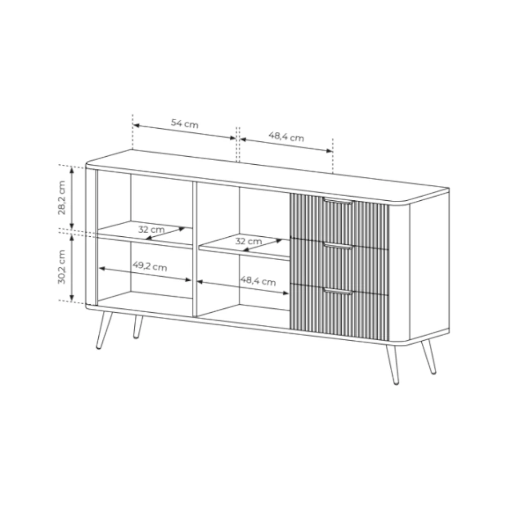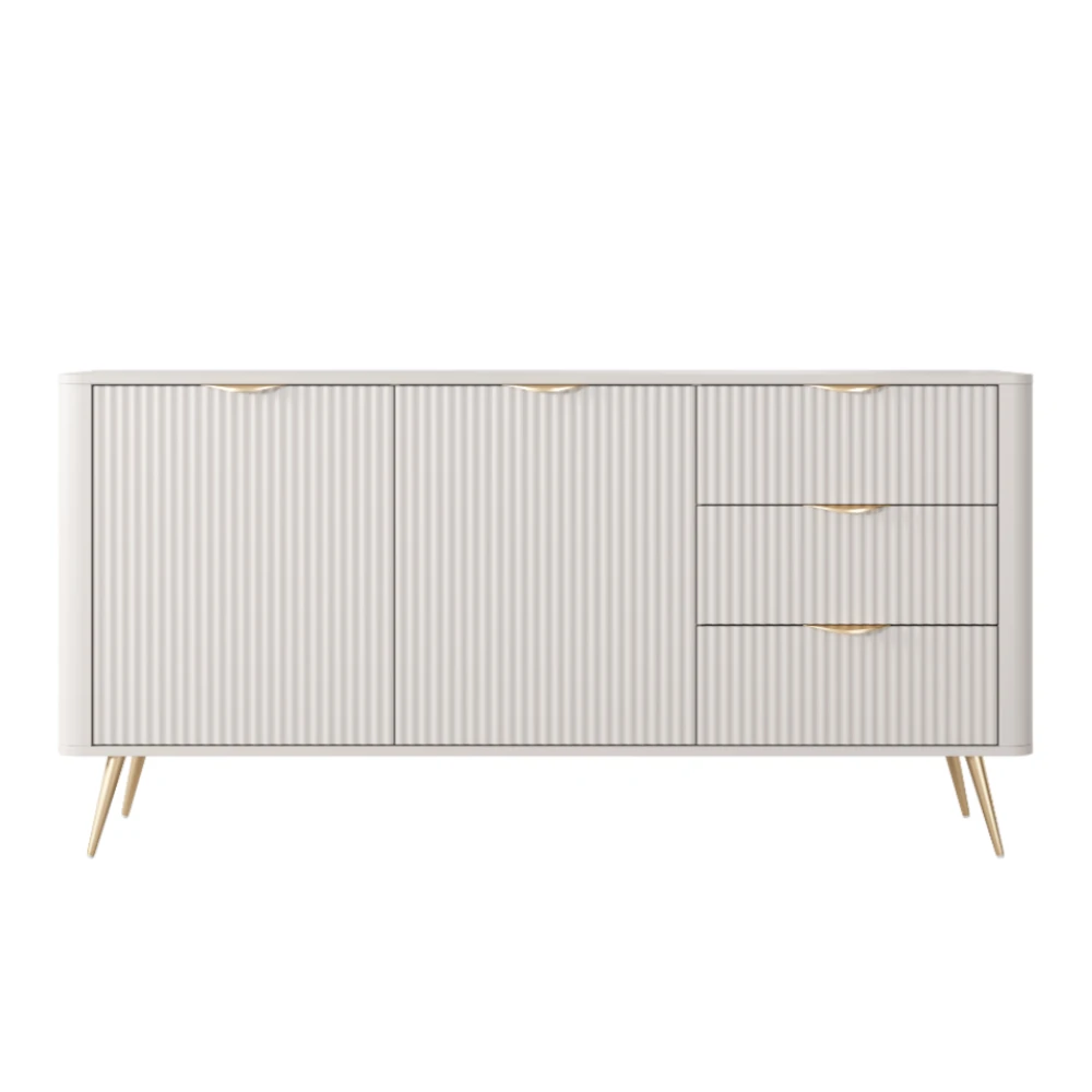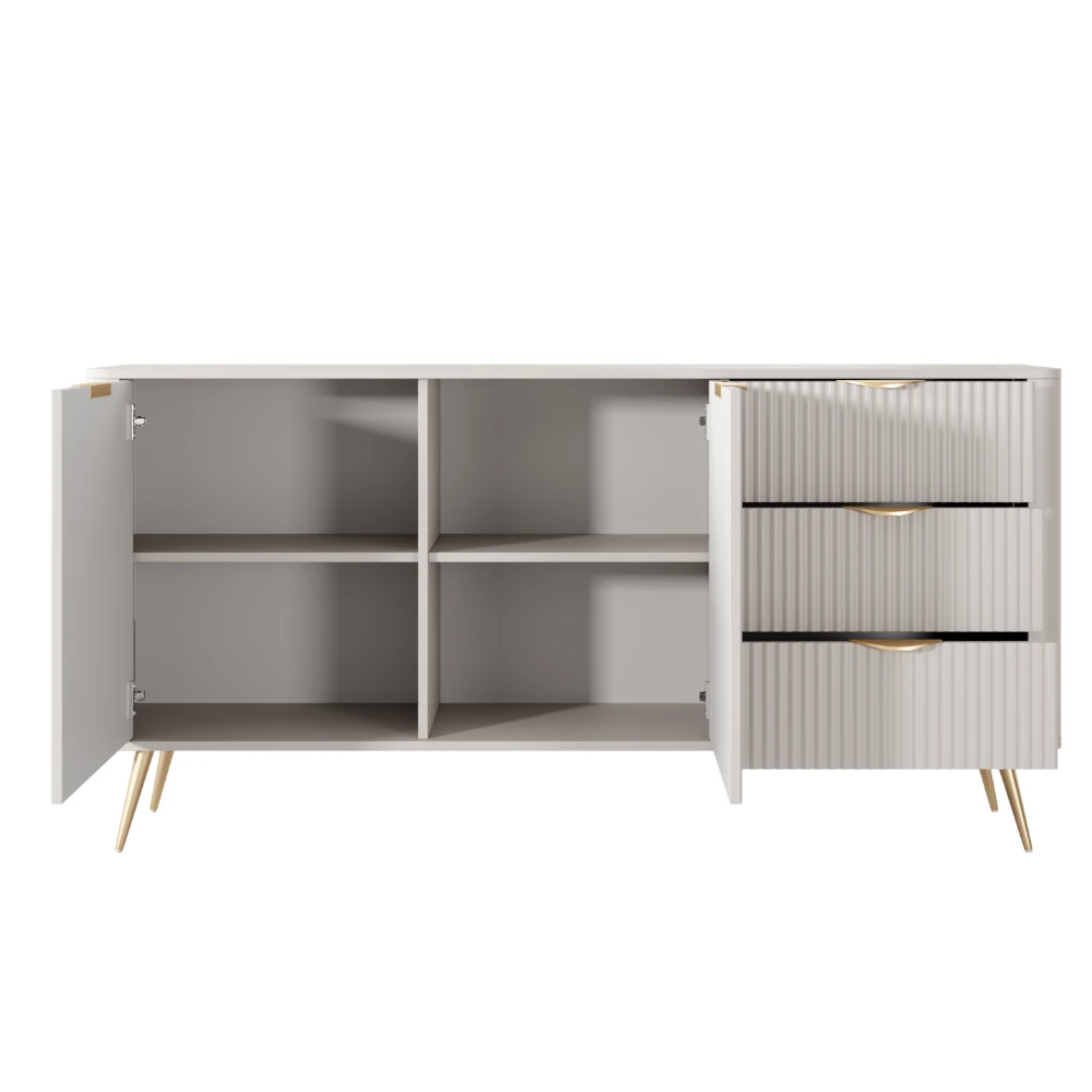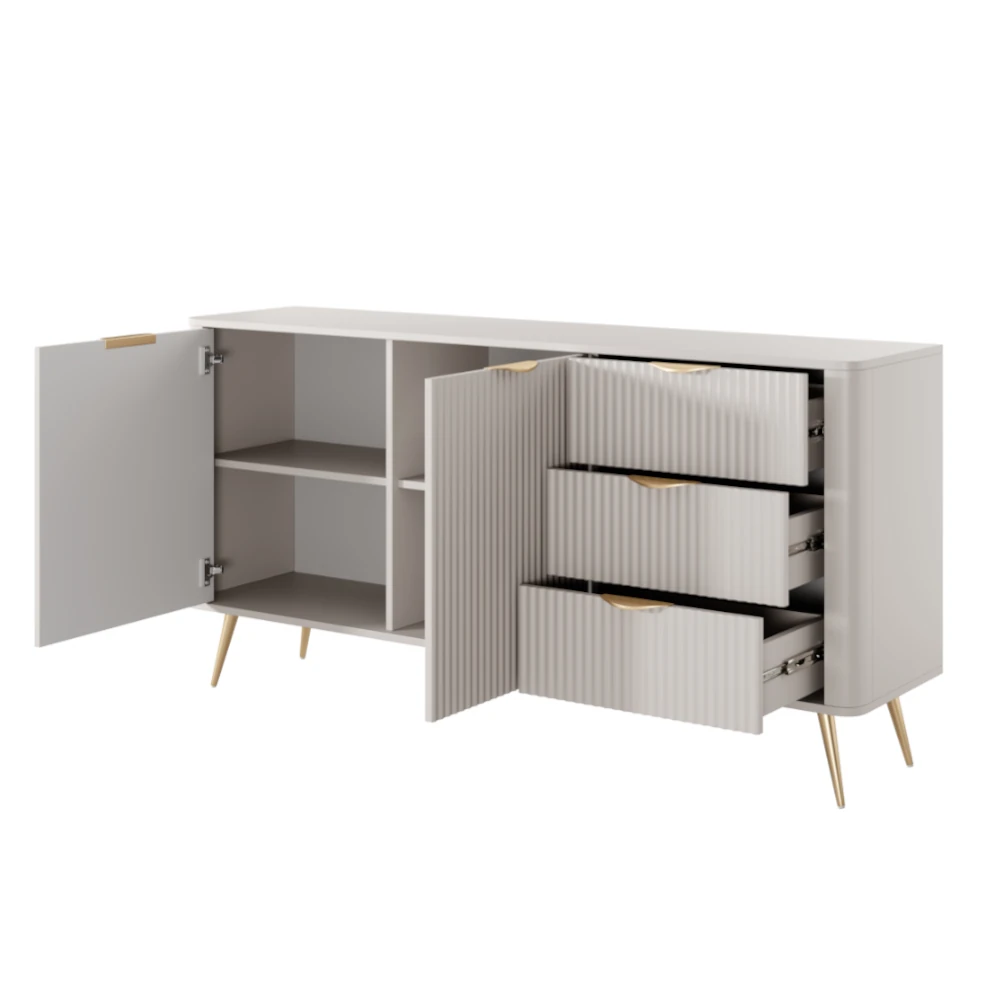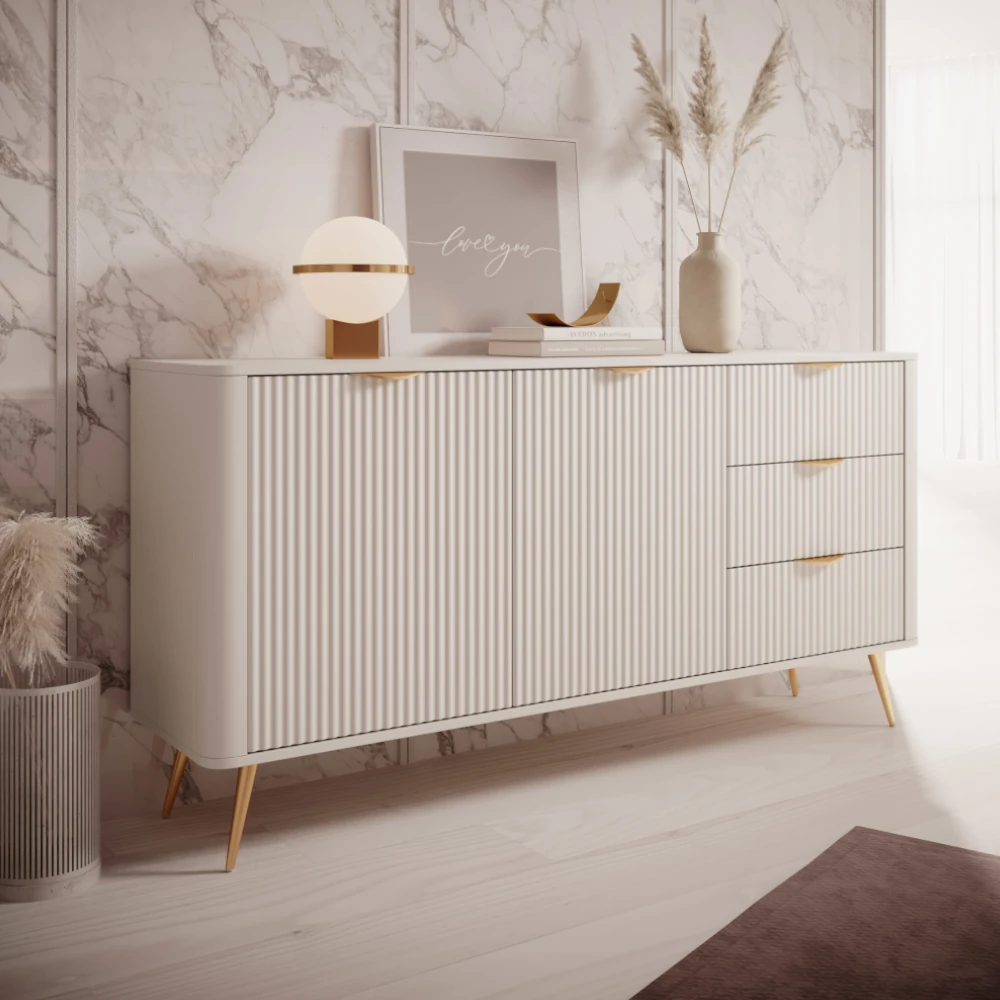 Komoda Amelia z ryflowanymi frontami to nowoczesny mebel do salonu, jadalni lub sypialni, łączący pojemne szafki z funkcjonalnymi szufladami oraz dekoracyjnym, pionowym frezowaniem.