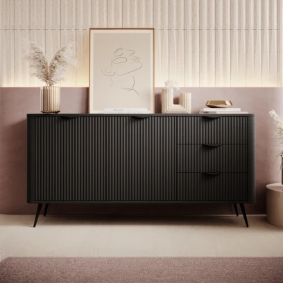 Komoda Amelia z ryflowanymi frontami to nowoczesny mebel do salonu, jadalni lub sypialni, łączący pojemne szafki z funkcjonalnymi szufladami oraz dekoracyjnym, pionowym frezowaniem.