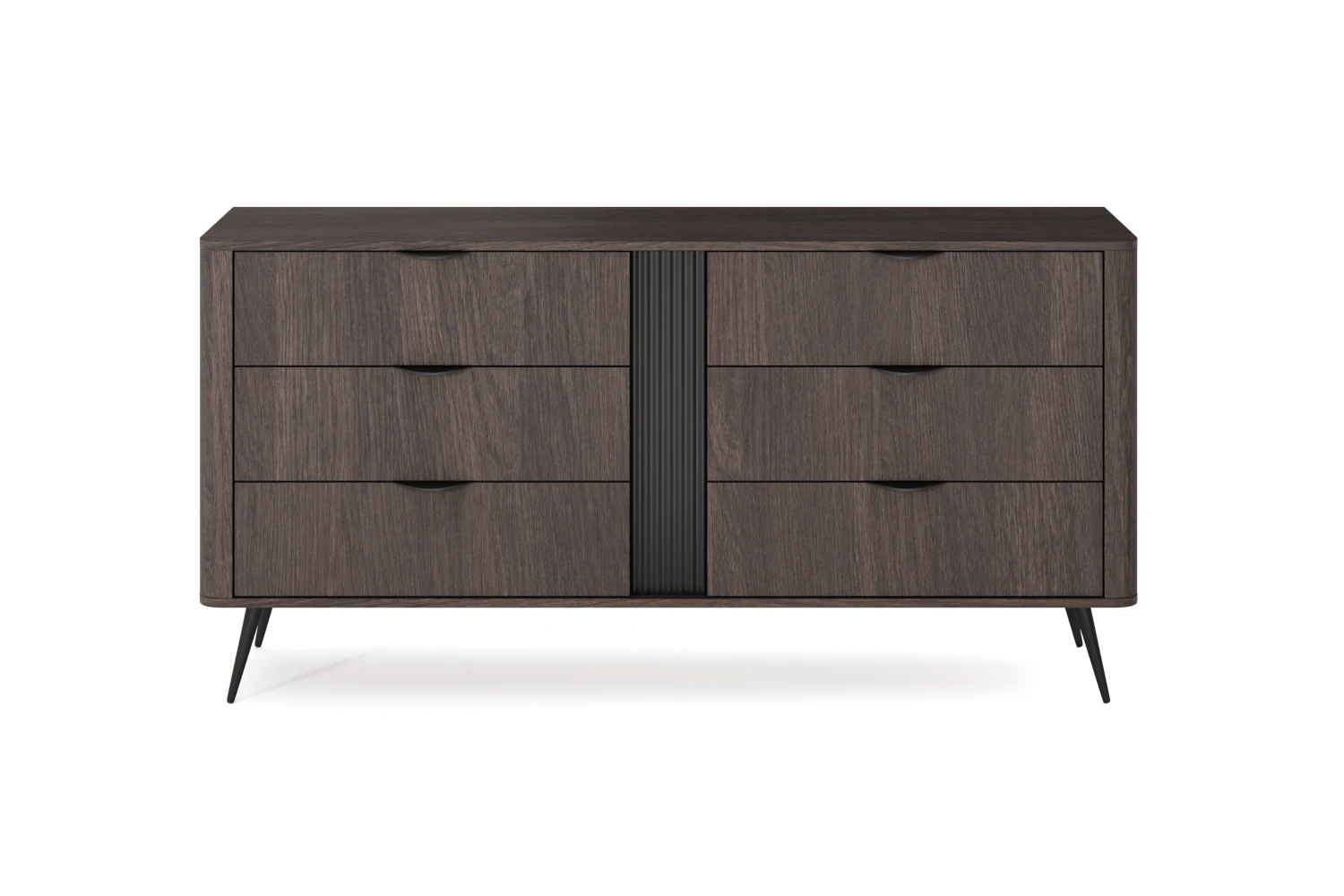 Komoda z pojemnymi szufladami Teris dąb Dunin to nowoczesny mebel do salonu lub sypialni, który łączy elegancki dekor ciemnego dębu z czarnymi, metalowymi nogami. Sześć przestronnych szuflad na pełnym wysuwie ułatwia przechowywanie ubrań, tekstyliów i drobiazgów, a charakterystyczna pionowa wstawka dodaje bryle lekkości i loftowego charakteru.