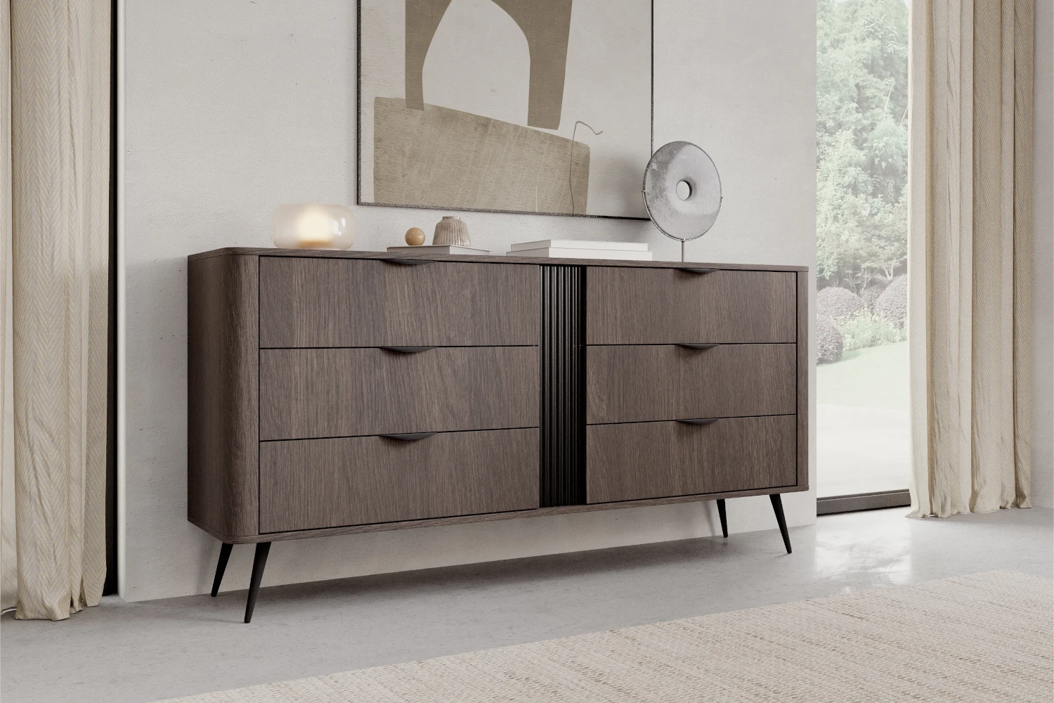 Komoda z pojemnymi szufladami Teris dąb Dunin to propozycja dla osób, które szukają funkcjonalnego i efektownego mebla do nowoczesnego wnętrza. Ciemny dekor dębu Dunin w połączeniu z czarnymi, smukłymi nogami i ryflowaną wstawką tworzy spójną, elegancką całość – idealną do salonu, sypialni lub garderoby.