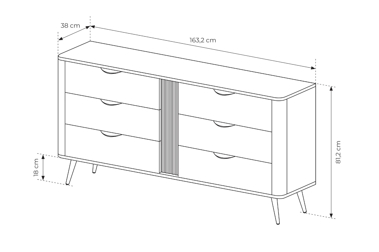 - Korpus Płyta wiórowa laminowana E05, 16mm + zaoblona listwa MDF na bokach + ryflowana wstawka z płyty MDF 18 mm