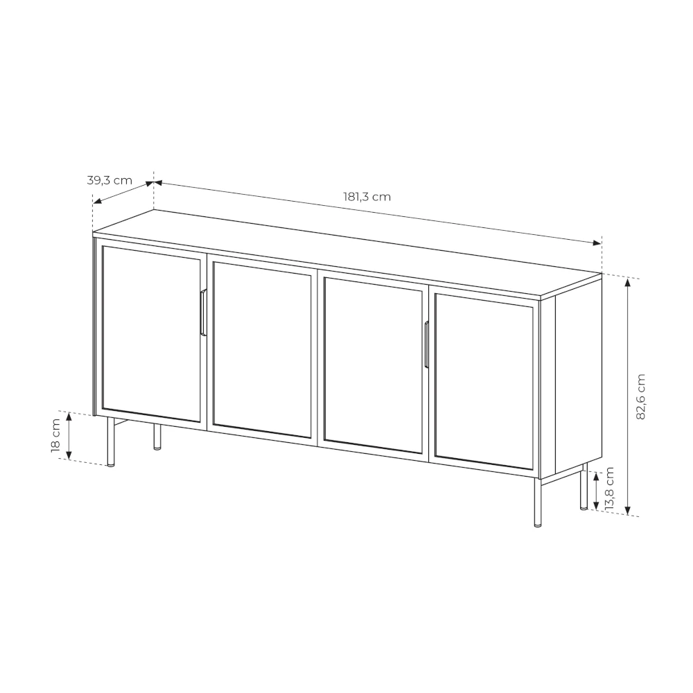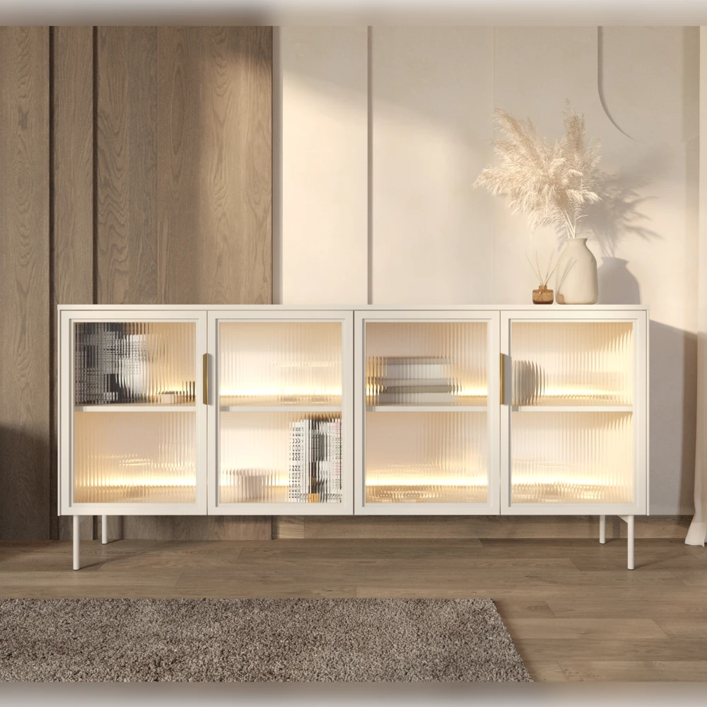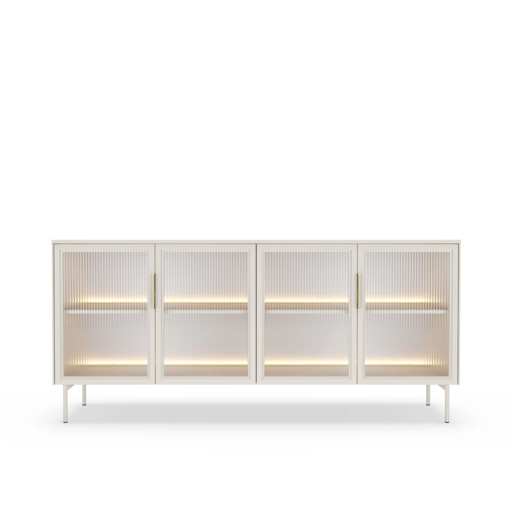 Komoda z przeszklonymi drzwiczkami z oświetleniem LED Nokta Kaszmir została zaprojektowana z myślą o nowoczesnych wnętrzach, w których liczy się zarówno styl, jak i funkcjonalność. Cztery szklane fronty w kaszmirowych ramach eksponują zawartość półek, a neutralne światło LED delikatnie eksponuje dekoracje ustawione wewnątrz.