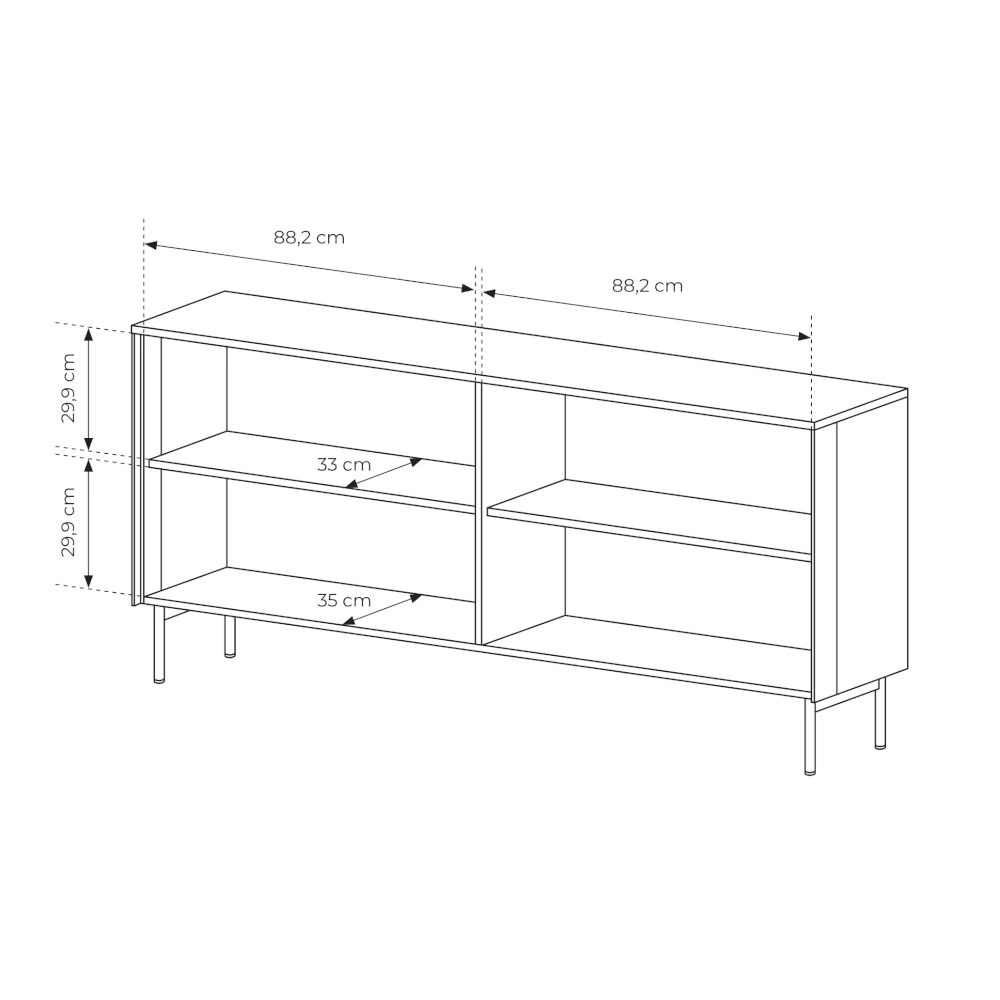 Korpus komody wykonano z płyty wiórowej laminowanej w kolorze kaszmirowym, która pięknie komponuje się z kaszmirowymi, metalowymi nogami i subtelnymi uchwytami. Smukła bryła na wysokich nóżkach dodaje lekkości i ułatwia utrzymanie porządku pod meblem, dzięki czemu komoda świetnie sprawdzi się zarówno w mniejszym, jak i przestronnym salonie.
