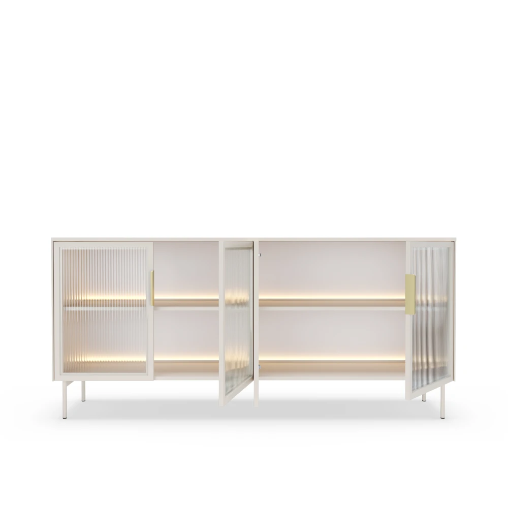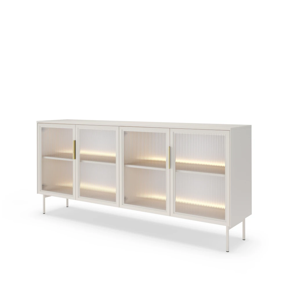 Komoda z przeszklonymi drzwiczkami z oświetleniem LED Nokta Kaszmir to elegancki, pojemny mebel do salonu lub jadalni, który łączy elegancki odcień kaszmiru z nowoczesnymi, szklanymi frontami i nastrojowym podświetleniem półek.