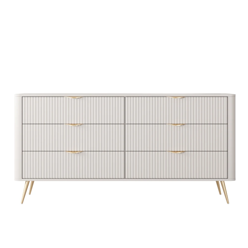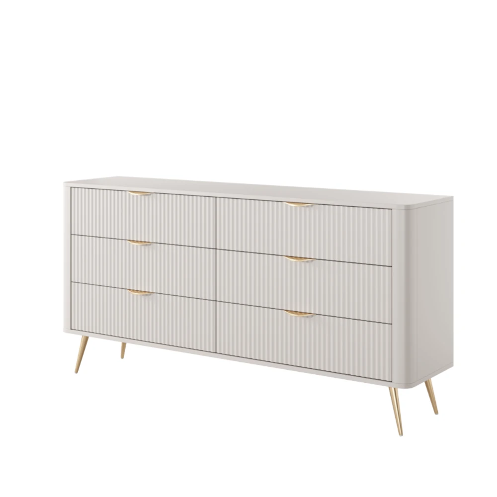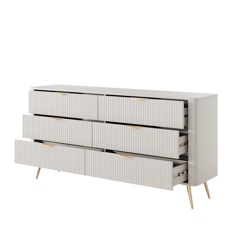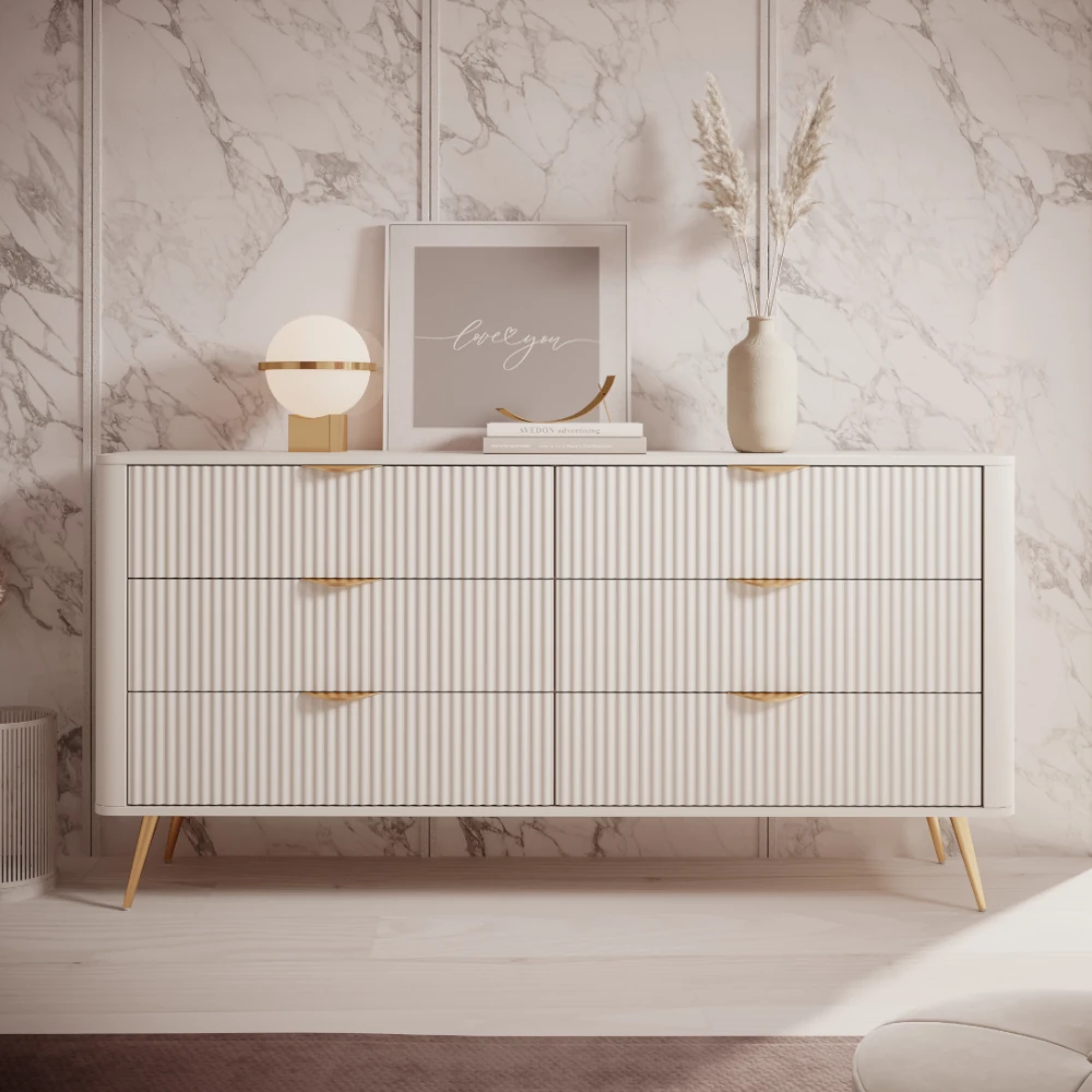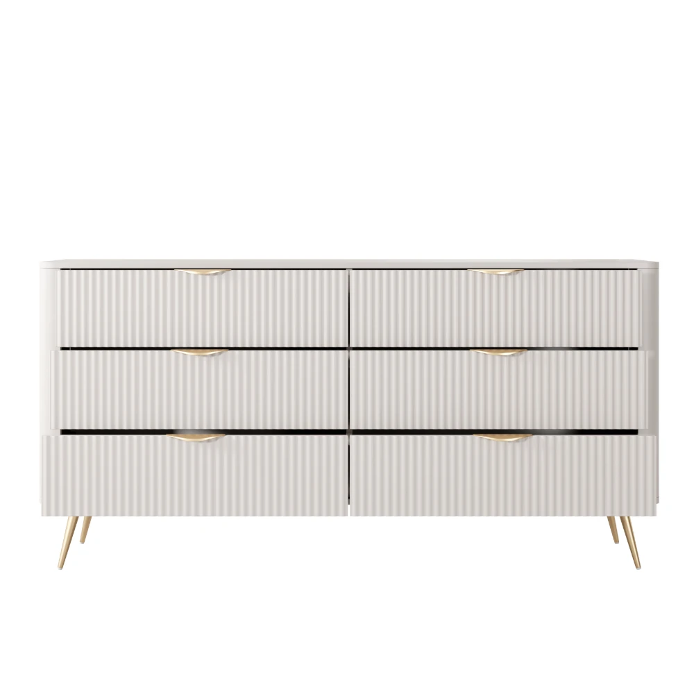 Komoda Amelia z szufladami to pojemny i elegancki mebel do salonu, sypialni lub garderoby. Sześć praktycznych szuflad z dekoracyjnymi, ryflowanymi frontami ułatwia przechowywanie ubrań i akcesoriów, a smukłe nóżki dodają lekkości całej bryle.