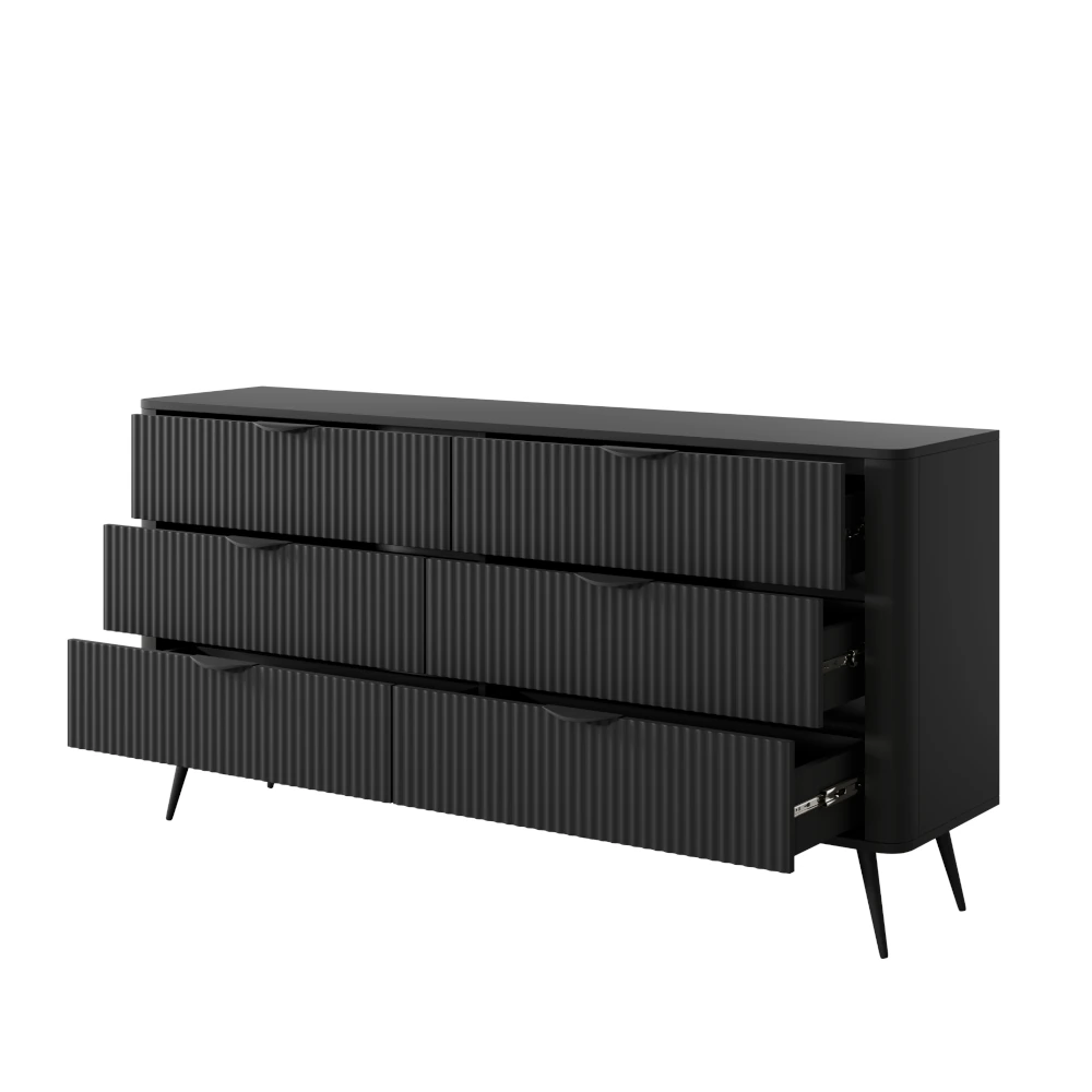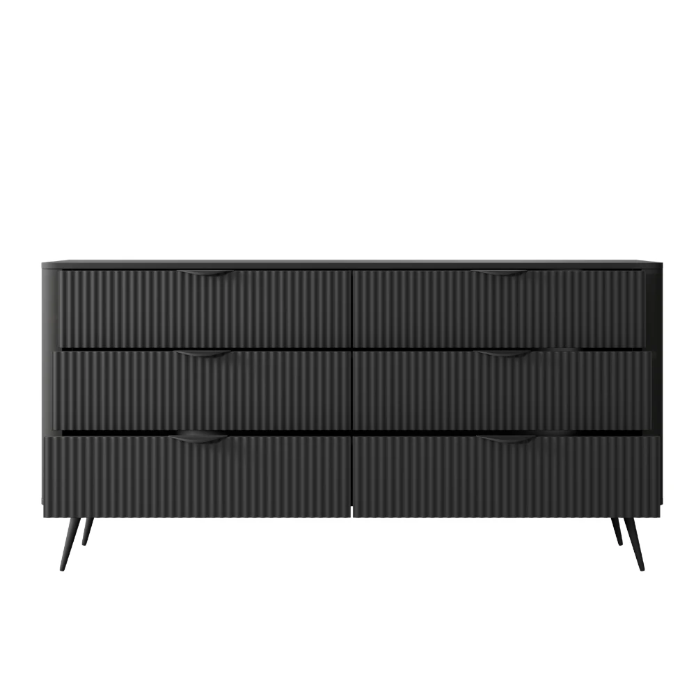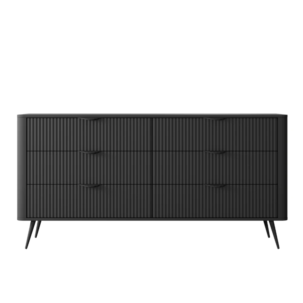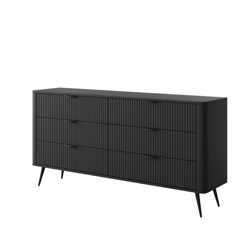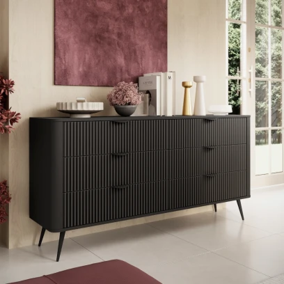 Komoda z szufladami Amelia to nowoczesny mebel o ponadczasowej formie, który łączy efektowny design z wysoką funkcjonalnością. Ryflowane fronty tworzą ciekawą grę światła i cienia, dzięki czemu komoda staje się mocnym elementem dekoracyjnym w aranżacji wnętrza.