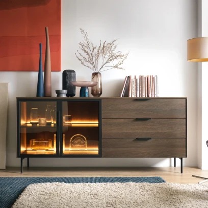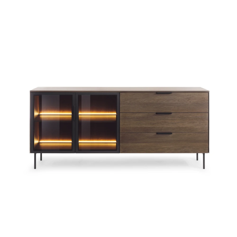 Komoda z witryną i szufladami z oświetleniem LED Nokta Dąb Dunin to elegancki mebel do salonu, który łączy funkcję pojemnej komody z nastrojową witryną na dekoracje. Ciepłe światło LED podkreśla piękno forniru w kolorze dąb dunin i nadaje wnętrzu przytulny, nowoczesny charakter.