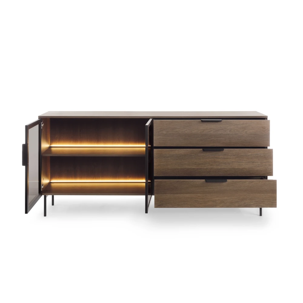 Komoda z witryną i szufladami z oświetleniem LED Nokta Dąb Dunin to propozycja dla osób, które lubią łączyć praktyczne rozwiązania z nowoczesnym designem. Przeszklona część z podświetleniem LED pięknie eksponuje szkło, ceramikę lub ulubione dekoracje, a trzy pojemne szuflady i zamykana część z półkami zapewniają dużo miejsca na domowe akcesoria.
