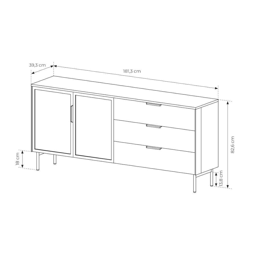 Korpus komody wykonano z płyty wiórowej laminowanej E05 o grubości 16 mm, uzupełnionej listwą MDF na bokach. Fronty tworzy ramka MDF z hartowaną szybą w kolorze brązowy antisol oraz płyta wiórowa laminowana w dekorze dąb dunin. Całość osadzono na smukłych, metalowych nogach w czarnym kolorze, które dodają lekkości i podkreślają subtelnie loftowy charakter mebla.