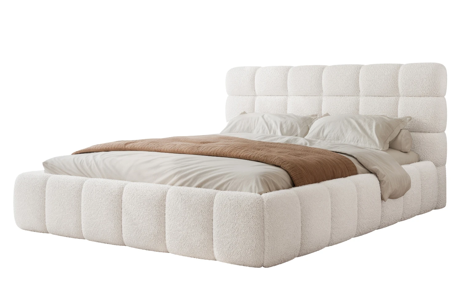 Łóżko tapicerowane Bubble z praktycznym pojemnikiem na pościel to idealny wybór do nowoczesnej sypialni. Miękka, modna tkanina bouclé Abriamo 04 w odcieniu kremowym nadaje wnętrzu przytulności, a schowek pod całą powierzchnią spania pomaga utrzymać porządek. W zestawie znajduje się drewniany stelaż, a łóżko dostępne jest w popularnych szerokościach 140/160/180 cm.