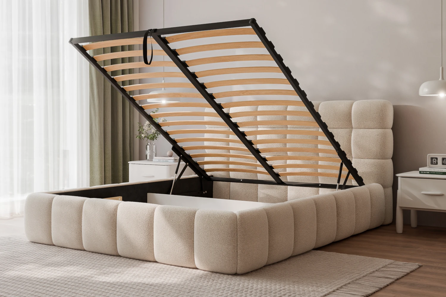 Łóżko tapicerowane Bubble z praktycznym pojemnikiem na pościel to idealny wybór do nowoczesnej sypialni. Miękka, modna tkanina bouclé Abriamo 05 w odcieniu szarości nadaje wnętrzu przytulności, a schowek pod całą powierzchnią spania pomaga utrzymać porządek. W zestawie znajduje się drewniany stelaż, a łóżko dostępne jest w popularnych szerokościach 140/160/180 cm.