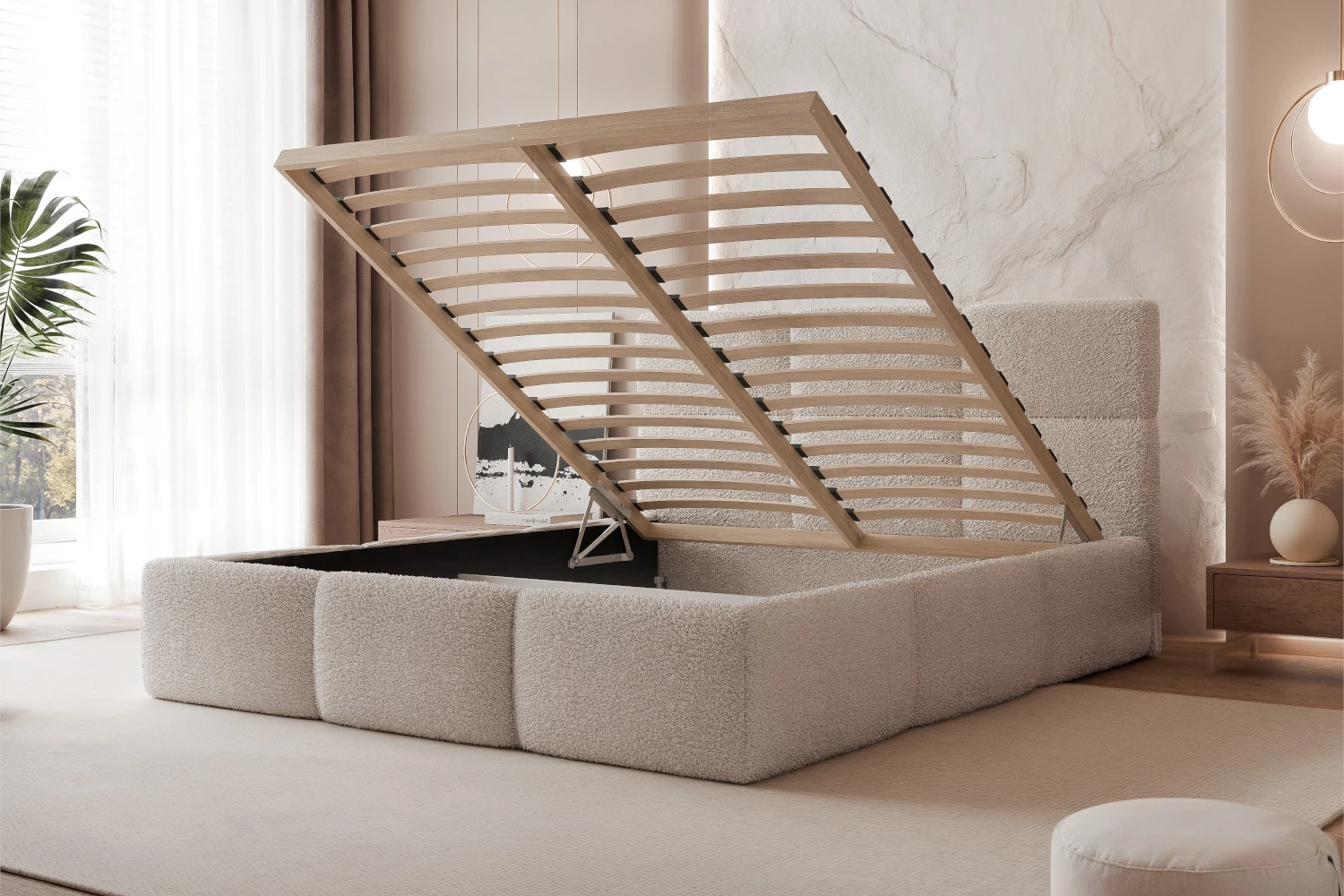 Wybierając łóżko tapicerowane z kolekcji Moti, zyskujesz mebel o unikalnym designie i bardzo solidnej konstrukcji. Dzięki zastosowaniu puszystej tkaniny bouclé, łóżko stanie się centralną ozdobą sypialni, łącząc w sobie zalety mebla luksusowego oraz praktycznego łóżka z pojemnikiem. Model dostępny jest w kilku szerokościach, co pozwoli Ci na idealne dopasowanie go do wymiarów Twojego materaca.