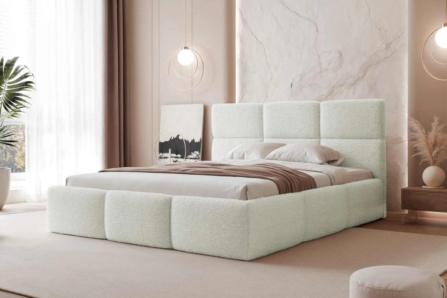 Jeśli szukasz mebla, który ociepli Twoją sypialnię i nada jej luksusowego klimatu, łóżko tapicerowane Moti będzie idealnym rozwiązaniem. Jego znakiem rozpoznawczym są głębokie przeszycia tworzące efektowne, miękkie segmenty na zagłówku oraz wokół całej ramy. Wykończenie z tkaniny Coral 70 w kolorze białym sprawia, że mebel prezentuje się niezwykle modnie, a unikalna struktura materiału typu bouclé (baranek) przyciąga wzrok i jest niesamowicie przyjemna w dotyku.