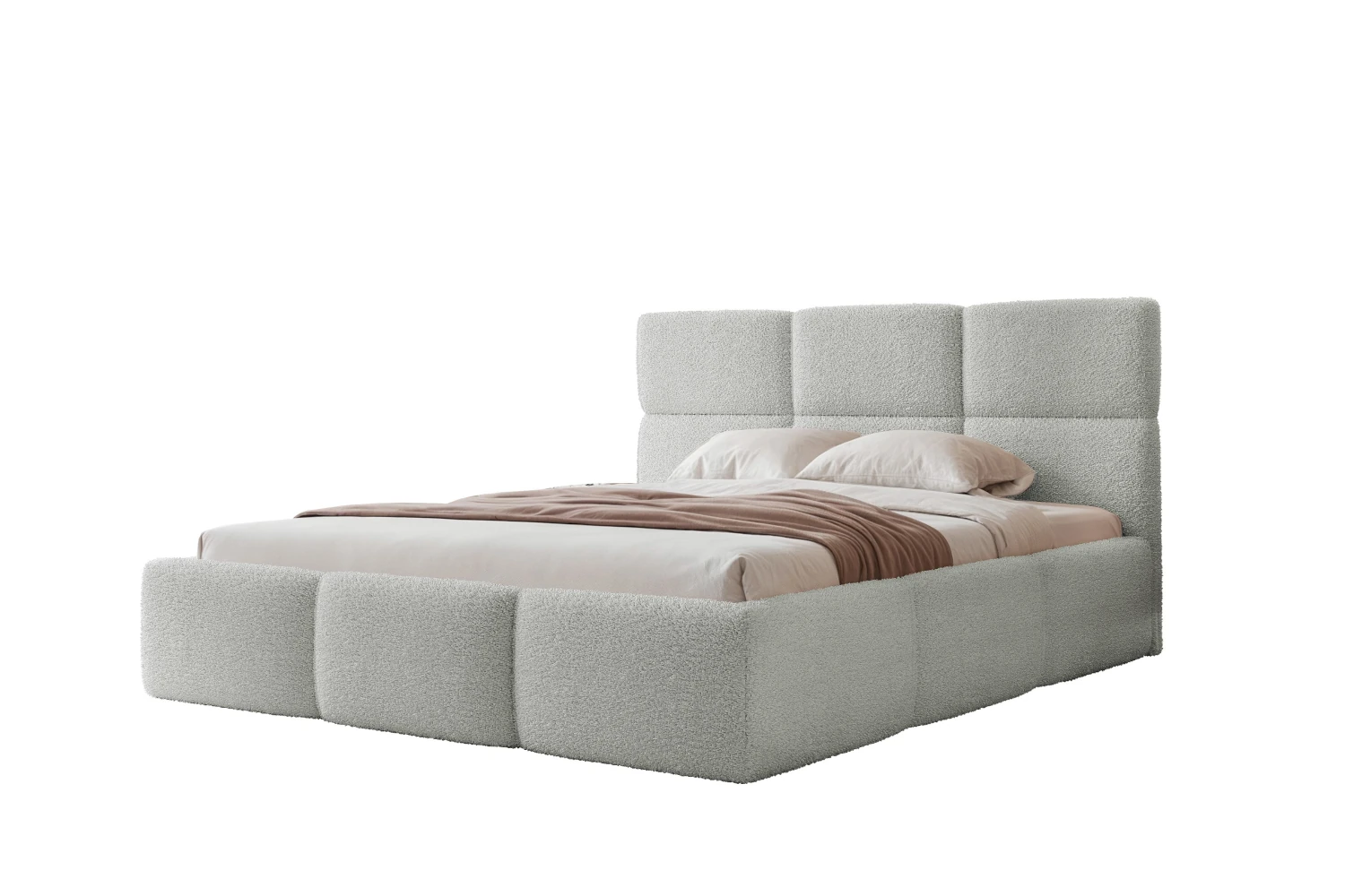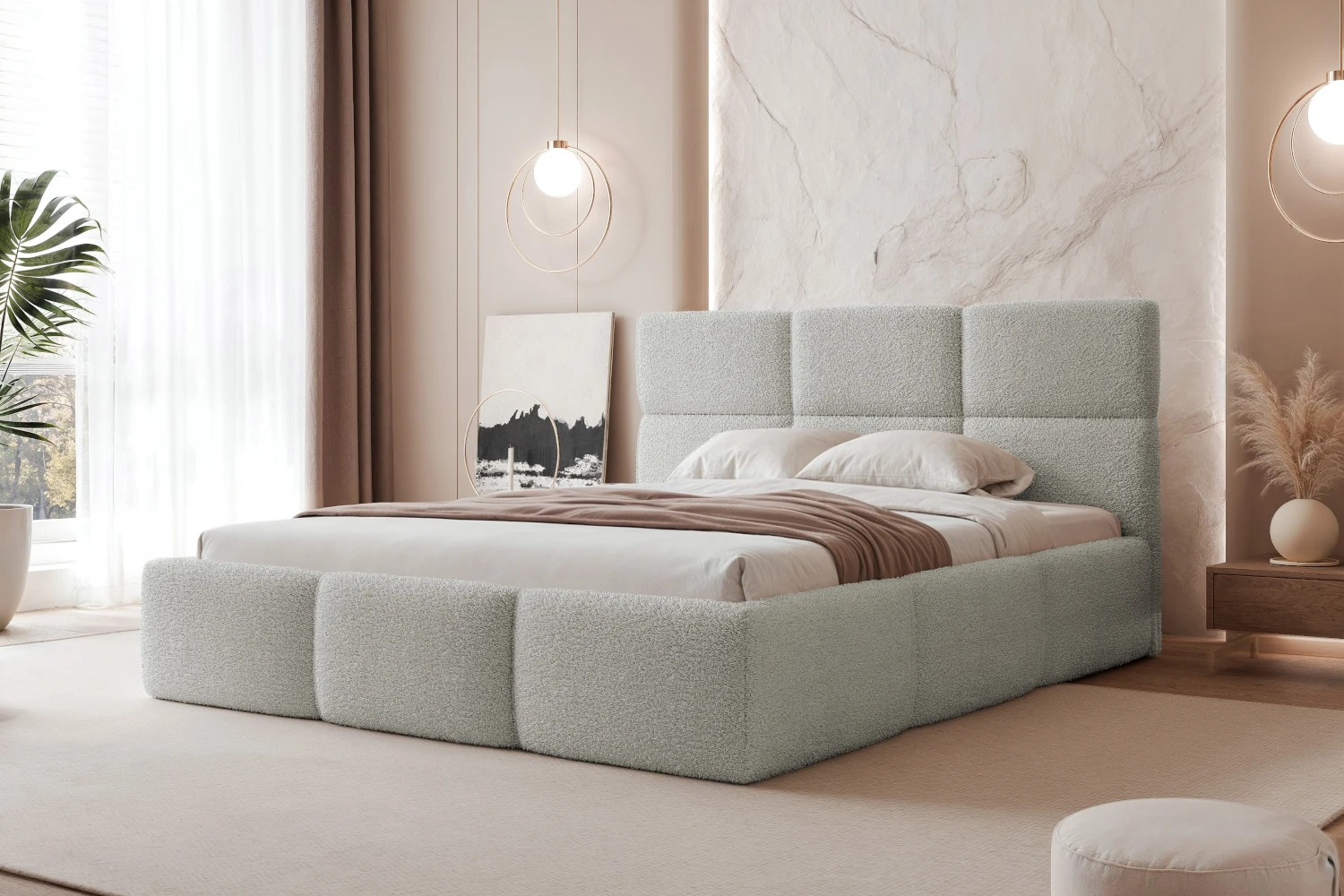 Jeśli szukasz mebla, który ociepli Twoją sypialnię i nada jej luksusowego klimatu, łóżko tapicerowane Moti będzie idealnym rozwiązaniem. Jego znakiem rozpoznawczym są głębokie przeszycia tworzące efektowne, miękkie segmenty na zagłówku oraz wokół całej ramy. Wykończenie z tkaniny Coral 85 w kolorze platynowy szary sprawia, że mebel prezentuje się niezwykle modnie, a unikalna struktura materiału typu bouclé (baranek) przyciąga wzrok i jest niesamowicie przyjemna w dotyku.