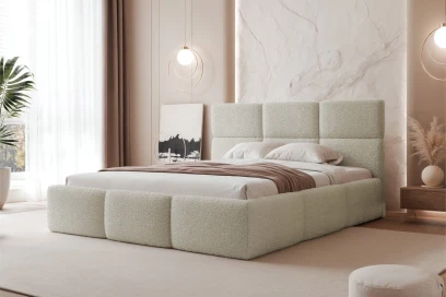 Łóżka tapicerowane z pojemnikiem i stelażem Moti to doskonały wybór dla osób szukających połączenia przytulności i nowoczesnego designu. Mebel został wykończony niezwykle modną tkaniną Coral o strukturze bouclé, która nadaje mu miękki i designerski charakter. Wyposażone w pojemny schowek pod całą powierzchnią spania oraz solidny stelaż drewniany, łóżko to łączy codzienną funkcjonalność z wyjątkowym komfortem wypoczynku.