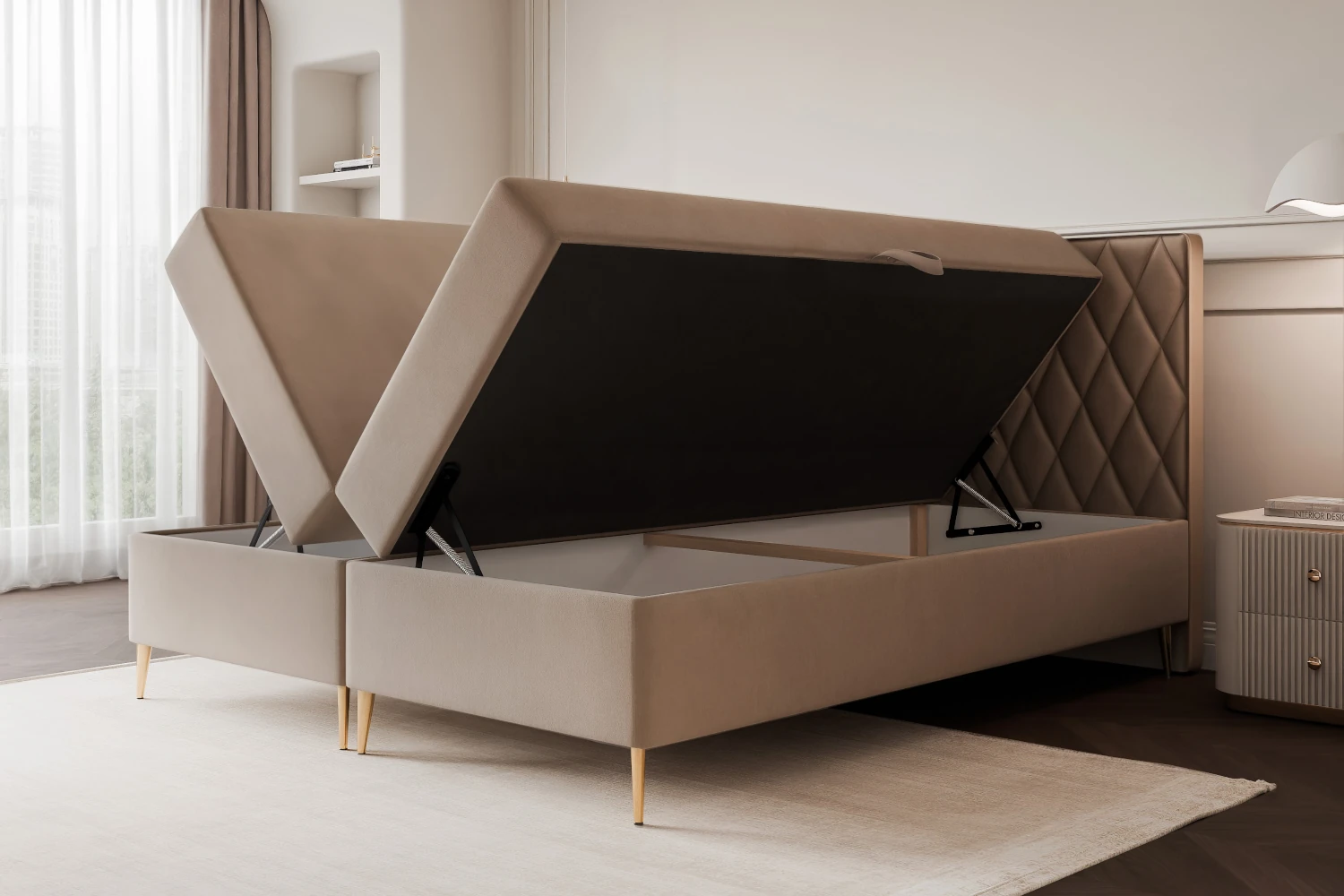 Łóżko kontynentalne z nóżkami Royal to połączenie eleganckiego wyglądu, wygody snu i praktycznych rozwiązań, które sprawdzą się w każdej stylowej sypialni. Ten model został zaprojektowany z myślą o osobach, które szukają mebla łączącego komfort codziennego odpoczynku z funkcjonalnością, dlatego świetnie sprawdzi się zarówno w nowoczesnych, jak i bardziej klasycznych aranżacjach.