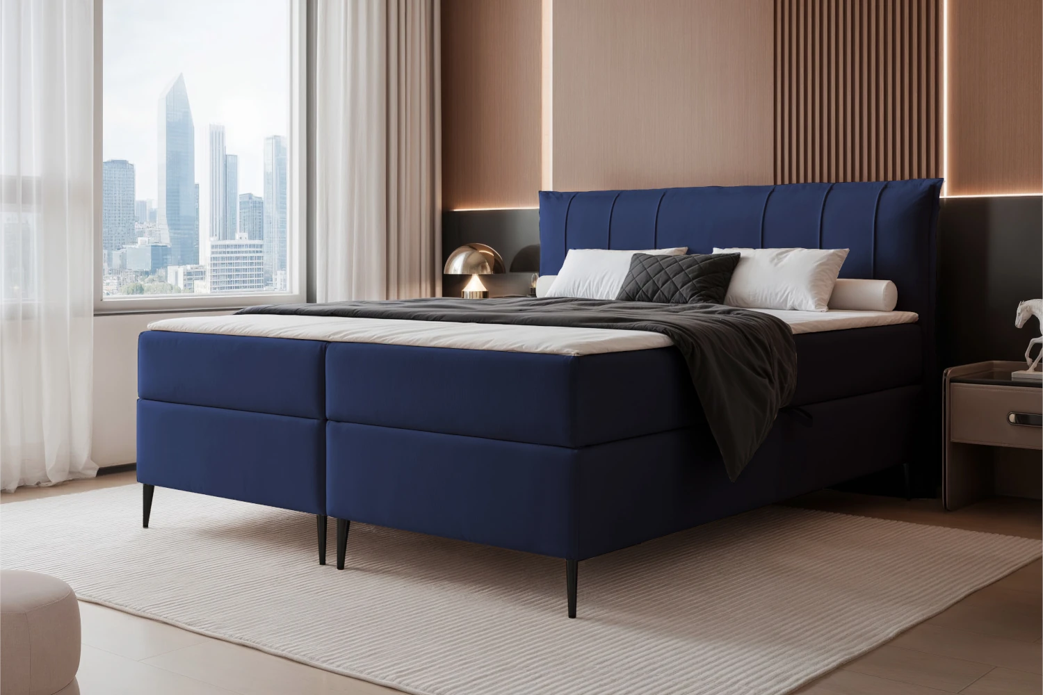 Łóżko kontynentalne z nóżkami i pojemnikiem na pościel Vertico Granatowy