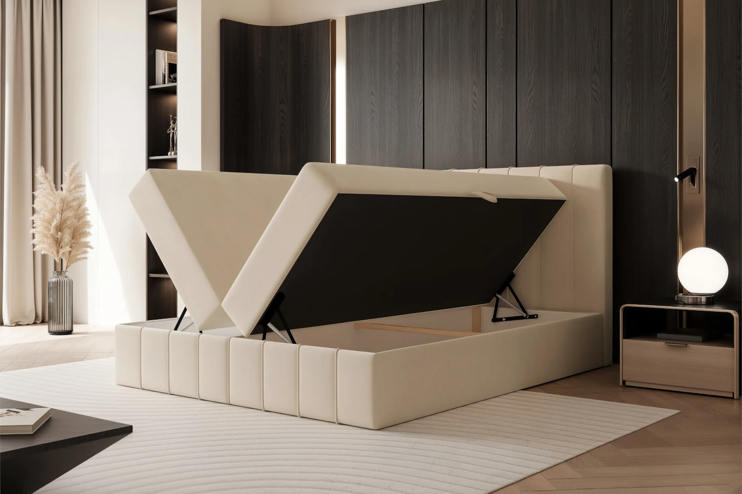 Dużym atutem tego modelu jest praktyczny pojemnik na pościel, umieszczony pod całą powierzchnią łóżka. Dzięki bocznemu otwieraniu codzienne korzystanie z przestrzeni do przechowywania jest wygodne i intuicyjne. To rozwiązanie pomaga lepiej zorganizować sypialnię i zyskać dodatkowe miejsce na kołdry, poduszki, koce lub tekstylia sezonowe. Jeśli szukasz mebla, który łączy wygląd premium z praktycznym zastosowaniem, łóżko z pojemnikiem na pościel Elite będzie bardzo dobrym wyborem.