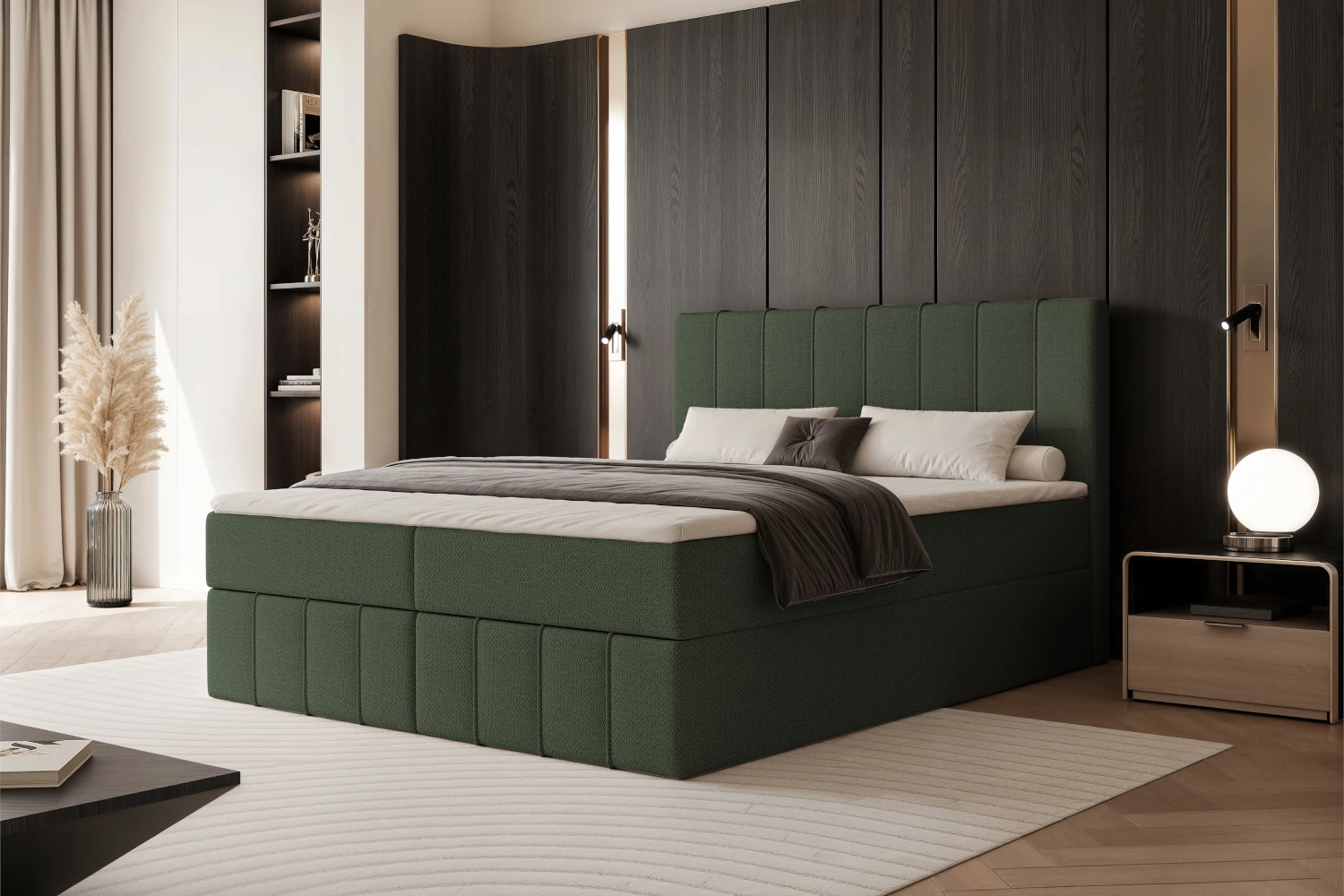 Łóżko kontynentalne Elite zostało zaprojektowane z myślą o wygodzie, estetyce i funkcjonalności, dzięki czemu doskonale sprawdza się jako centralny element nowoczesnej sypialni. Tapicerka w odcieniu ciemnej zieleni nadaje bryle lekkości i elegancji, a wysokie wezgłowie podkreśla reprezentacyjny charakter mebla. To model, który świetnie wpisuje się zarówno w jasne, minimalistyczne wnętrza, jak i bardziej klasyczne aranżacje.
