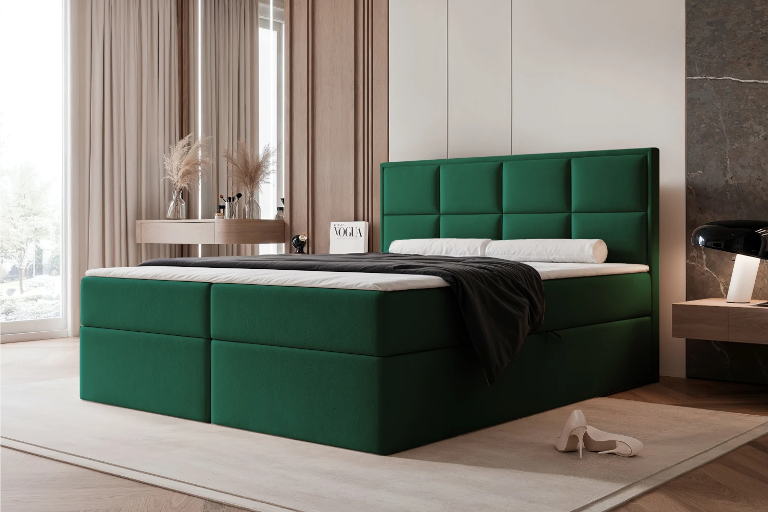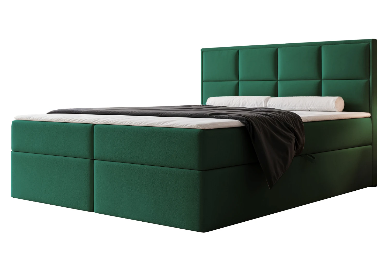 Łóżko kontynentalne Imperial to połączenie wyrazistego designu, komfortu snu i praktycznych rozwiązań, które doskonale sprawdzają się w nowoczesnej sypialni. Zielony kolor w połączeniu z eleganckim, tapicerowanym zagłówkiem z panelami tworzy efektowną bryłę, która przyciąga wzrok i nadaje wnętrzu bardziej stylowy, dopracowany charakter. To model stworzony z myślą o osobach, które szukają mebla wygodnego, funkcjonalnego i estetycznie wykończonego.