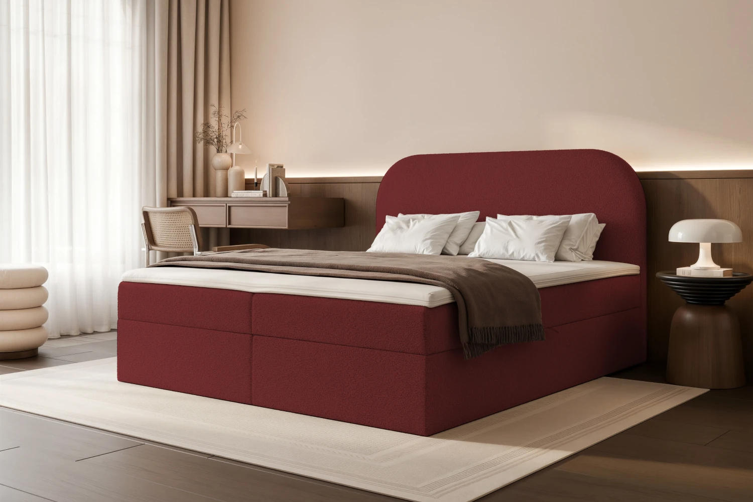 Łóżko kontynentalne Lunaro zostało zaprojektowane z myślą o maksymalnym komforcie snu i eleganckim wyglądzie sypialni. Wysokie, półokrągłe wezgłowie miękko otula strefę wypoczynku, tworząc idealne oparcie do czytania książek czy oglądania telewizji. Delikatny, neutralny odcień tapicerki sprawia, że łóżko kontynentalne z tkaniny sherpa doskonale komponuje się zarówno z jasnymi, jak i ciemniejszymi dodatkami, dzięki czemu łatwo dopasować je do różnych stylów - od minimalizmu, przez nowoczesny glamour, po modne wnętrza w duchu japandi.