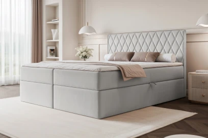 Łóżko kontynentalne Royal to elegancka propozycja do nowoczesnej i przytulnej sypialni. Model łączy komfort codziennego użytkowania z praktycznymi rozwiązaniami, takimi jak pojemnik na pościel, topper w zestawie oraz wygodne otwieranie boczne. Tapicerka w tkaninie Magic Velvet 2240 w odcieniu szarości nadaje meblowi subtelny, ponadczasowy charakter, a wysokie zagłowie z dekoracyjnym pikowaniem podkreśla jego elegancki wygląd. To łóżko kontynentalne do sypialni dostępne w kilku szerokościach, dzięki czemu łatwo dopasujesz je do wielkości wnętrza.