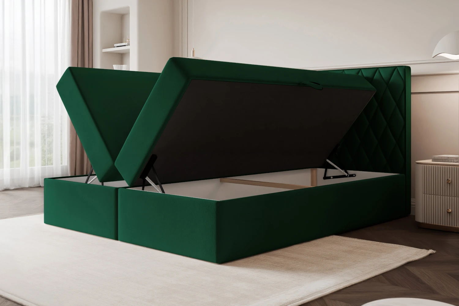 Model Royal to funkcjonalne łóżko kontynentalne tapicerowane, które zapewnia wygodę podczas codziennego wypoczynku i snu. Konstrukcja została wyposażona w pojemnik na pościel pod całą powierzchnią łóżka, co pozwala lepiej wykorzystać przestrzeń w sypialni i zyskać dodatkowe miejsce do przechowywania kołdry, poduszek, koców lub tekstyliów sezonowych. Zastosowane otwieranie boczne ułatwia dostęp do wnętrza pojemnika i sprawia, że korzystanie z mebla jest wygodne na co dzień.