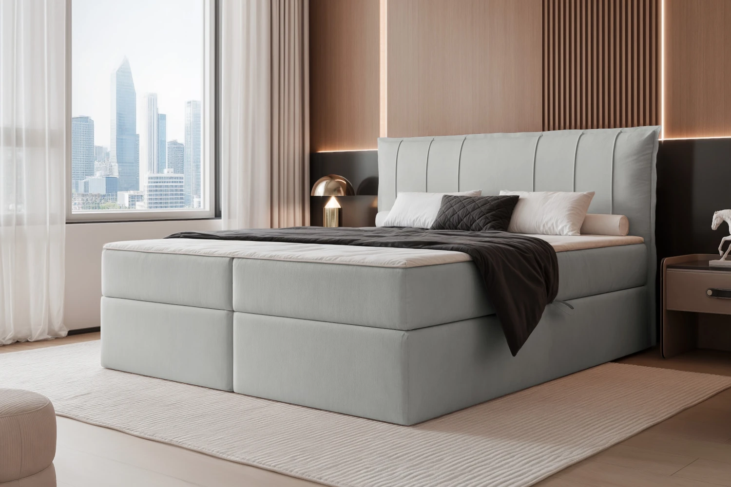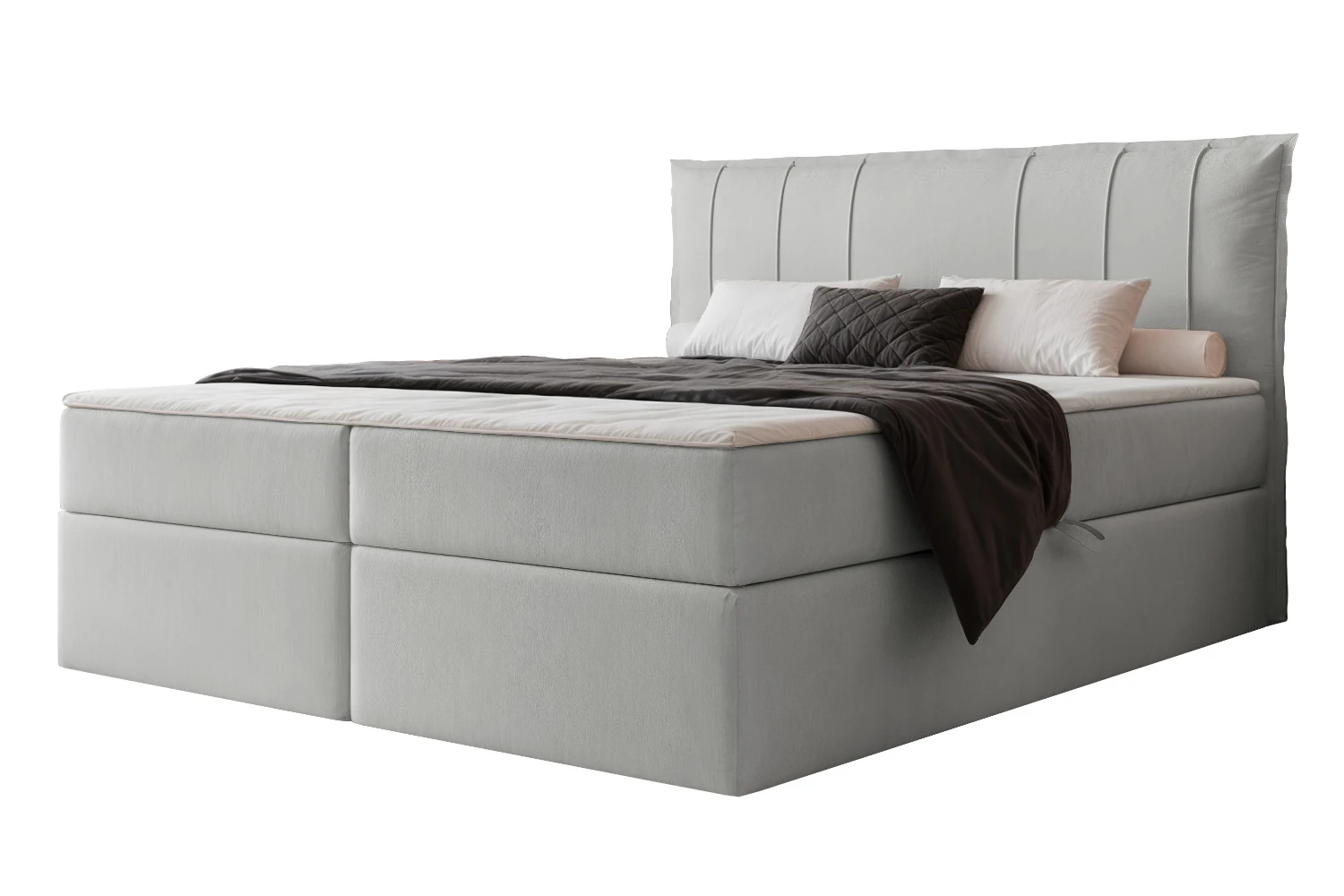 Łóżko kontynentalne z pojemnikiem na pościel Vertico to elegancka i funkcjonalna propozycja do nowoczesnej sypialni. Model został wyposażony w praktyczny pojemnik na pościel, wygodny topper w zestawie oraz komfortowy wkład bonellowy, który sprzyja codziennemu wypoczynkowi. Tapicerka w odcieniu szarości wykonana z tkaniny Magic Velvet 2240 nadaje całości subtelny, stylowy charakter. Łóżko kontynentalne sprawdzi się zarówno w mniejszych, jak i większych sypialniach.